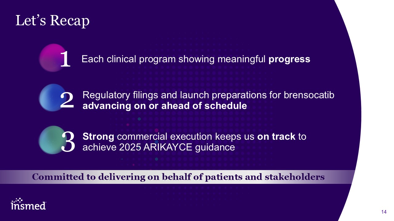 Let’s Recap  Each clinical program showing meaningful progress  Regulatory filings and launch preparations for brensocatib advancing on or ahead of schedule  Strong commercial execution keeps us on track to achieve 2025 ARIKAYCE guidance  Committed to delivering on behalf of patients and stakeholders