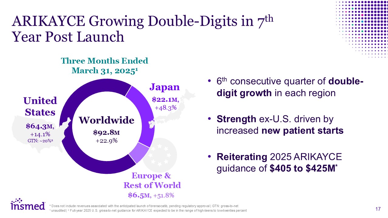 ARIKAYCE Growing Double-Digits in 7th Year Post Launch  6th consecutive quarter of double-digit growth in each region  Strength ex-U.S. driven by increased new patient starts  Reiterating 2025 ARIKAYCE guidance of $405 to $425M*  United  States  $64.3M,  +14.1%  GTN: ~20%2  Japan  $22.1M, +48.3%  Europe &   Rest of World  $6.5M, +51.8%  Worldwide  $92.8M  +22.9%  Three Months Ended   March 31, 20251  * Does not include revenues associated with the anticipated launch of brensocatib, pending regulatory approval | GTN: gross-to-net   1 unaudited | 2 Full-year 2025 U.S. gross-to-net guidance for ARIKAYCE expected to be in the range of high-teens to low-twenties percent