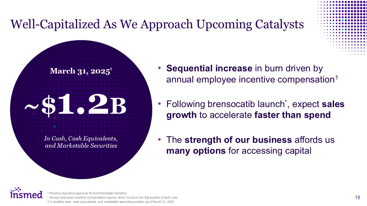 Well-Capitalized As We Approach Upcoming Catalysts  Sequential increase in burn driven by annual employee incentive compensation1  Following brensocatib launch*, expect sales growth to accelerate faster than spend  The strength of our business affords us many options for accessing capital  * Pending regulatory approval for bronchiectasis indication  1 Annual employee incentive compensation payout which occurs in the first-quarter of each year  † Unaudited cash, cash equivalents, and marketable securities position as of March 31, 2025  ~$1.2B  March 31, 2025†  In Cash, Cash Equivalents,   and Marketable Securities