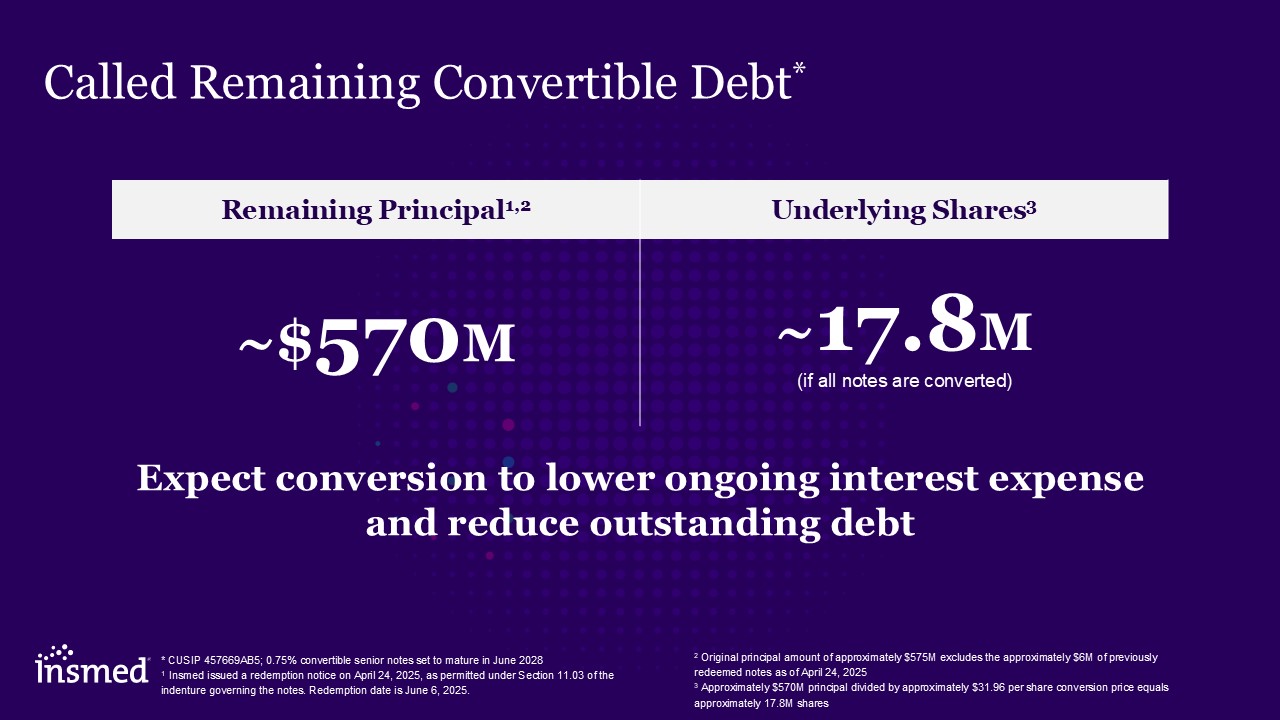 Called Remaining Convertible Debt*   Expect conversion to lower ongoing interest expense and reduce outstanding debt  Remaining Principal1,2  Underlying Shares3  ~$570M  ~17.8M  (if all notes are converted)  * CUSIP 457669AB5; 0.75% convertible senior notes set to mature in June 2028  1 Insmed issued a redemption notice on April 24, 2025, as permitted under Section 11.03 of the indenture governing the notes. Redemption date is June 6, 2025.  2 Original principal amount of approximately $575M excludes the approximately $6M of previously redeemed notes as of April 24, 2025  3 Approximately $570M principal divided by approximately $31.96 per share conversion price equals approximately 17.8M shares