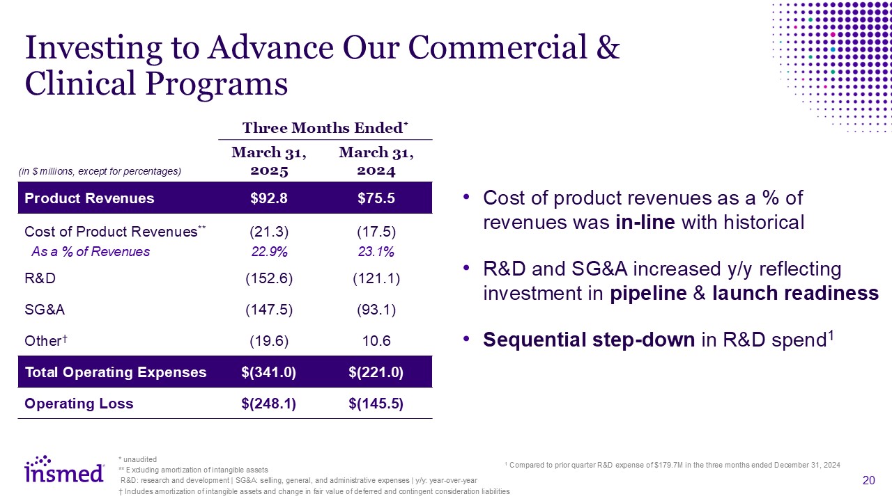 Investing to Advance Our Commercial & Clinical Programs  Three Months Ended*  March 31, 2025  March 31, 2024  Product Revenues  $92.8  $75.5  Cost of Product Revenues**   As a % of Revenues  (21.3)  22.9%  (17.5)  23.1%  R&D  (152.6)  (121.1)  SG&A  (147.5)  (93.1)  Other†  (19.6)  10.6  Total Operating Expenses  $(341.0)  $(221.0)  Operating Loss  $(248.1)  $(145.5)  Cost of product revenues as a % of revenues was in-line with historical  R&D and SG&A increased y/y reflecting investment in pipeline & launch readiness  Sequential step-down in R&D spend1   * unaudited  ** Excluding amortization of intangible assets   R&D: research and development | SG&A: selling, general, and administrative expenses | y/y: year-over-year  † Includes amortization of intangible assets and change in fair value of deferred and contingent consideration liabilities  1 Compared to prior quarter R&D expense of $179.7M in the three months ended December 31, 2024  (in $ millions, except for percentages)