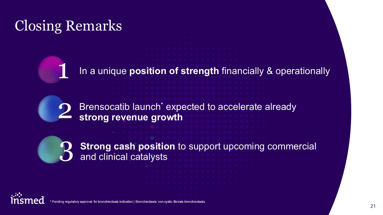 Closing Remarks  In a unique position of strength financially & operationally  Brensocatib launch* expected to accelerate already strong revenue growth  Strong cash position to support upcoming commercial and clinical catalysts  * Pending regulatory approval for bronchiectasis indication | Bronchiectasis: non-cystic fibrosis bronchiectasis