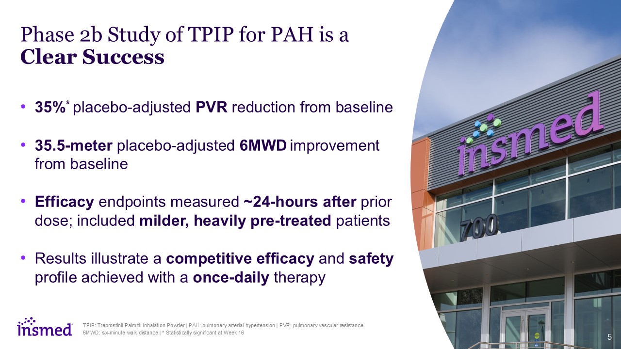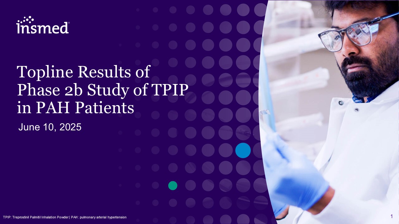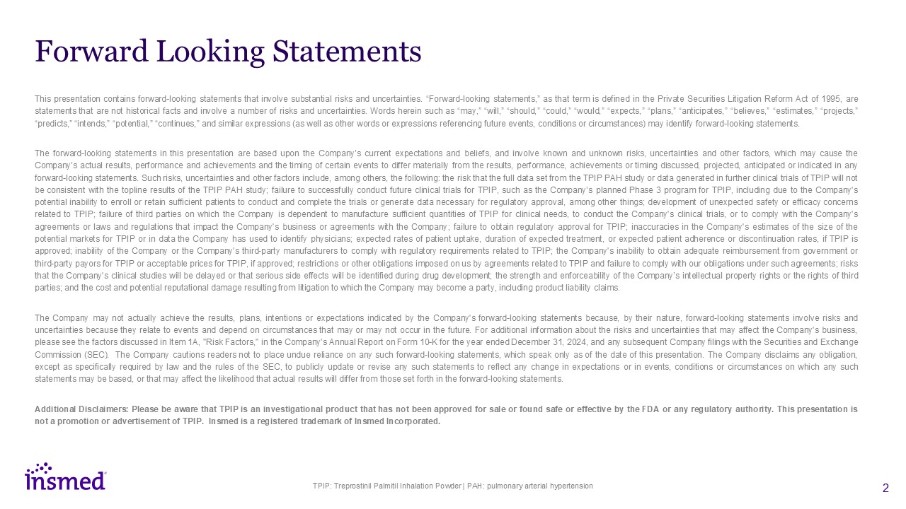 Forward Looking Statements  This presentation contains forward-looking statements that involve substantial risks and uncertainties. “Forward-looking statements,” as that term is defined in the Private Securities Litigation Reform Act of 1995, are statements that are not historical facts and involve a number of risks and uncertainties. Words herein such as “may,” “will,” “should,” “could,” “would,” “expects,” “plans,” “anticipates,” “believes,” “estimates,” “projects,” “predicts,” “intends,” “potential,” “continues,” and similar expressions (as well as other words or expressions referencing future events, conditions or circumstances) may identify forward-looking statements.  The forward-looking statements in this presentation are based upon the Company’s current expectations and beliefs, and involve known and unknown risks, uncertainties and other factors, which may cause the Company’s actual results, performance and achievements and the timing of certain events to differ materially from the results, performance, achievements or timing discussed, projected, anticipated or indicated in any forward-looking statements. Such risks, uncertainties and other factors include, among others, the following: the risk that the full data set from the TPIP PAH study or data generated in further clinical trials of TPIP will not be consistent with the topline results of the TPIP PAH study; failure to successfully conduct future clinical trials for TPIP, such as the Company’s planned Phase 3 program for TPIP, including due to the Company's potential inability to enroll or retain sufficient patients to conduct and complete the trials or generate data necessary for regulatory approval, among other things; development of unexpected safety or efficacy concerns related to TPIP; failure of third parties on which the Company is dependent to manufacture sufficient quantities of TPIP for clinical needs, to conduct the Company's clinical trials, or to comply with the Company's agreements or laws and regulations that impact the Company's business or agreements with the Company; failure to obtain regulatory approval for TPIP; inaccuracies in the Company's estimates of the size of the potential markets for TPIP or in data the Company has used to identify physicians; expected rates of patient uptake, duration of expected treatment, or expected patient adherence or discontinuation rates, if TPIP is approved; inability of the Company or the Company's third-party manufacturers to comply with regulatory requirements related to TPIP; the Company's inability to obtain adequate reimbursement from government or third-party payors for TPIP or acceptable prices for TPIP, if approved; restrictions or other obligations imposed on us by agreements related to TPIP and failure to comply with our obligations under such agreements; risks that the Company's clinical studies will be delayed or that serious side effects will be identified during drug development; the strength and enforceability of the Company’s intellectual property rights or the rights of third parties; and the cost and potential reputational damage resulting from litigation to which the Company may become a party, including product liability claims.   The Company may not actually achieve the results, plans, intentions or expectations indicated by the Company's forward-looking statements because, by their nature, forward-looking statements involve risks and uncertainties because they relate to events and depend on circumstances that may or may not occur in the future. For additional information about the risks and uncertainties that may affect the Company's business, please see the factors discussed in Item 1A, "Risk Factors," in the Company's Annual Report on Form 10-K for the year ended December 31, 2024, and any subsequent Company filings with the Securities and Exchange Commission (SEC).  The Company cautions readers not to place undue reliance on any such forward-looking statements, which speak only as of the date of this presentation. The Company disclaims any obligation, except as specifically required by law and the rules of the SEC, to publicly update or revise any such statements to reflect any change in expectations or in events, conditions or circumstances on which any such statements may be based, or that may affect the likelihood that actual results will differ from those set forth in the forward-looking statements.  Additional Disclaimers: Please be aware that TPIP is an investigational product that has not been approved for sale or found safe or effective by the FDA or any regulatory authority. This presentation is not a promotion or advertisement of TPIP. Insmed is a registered trademark of Insmed Incorporated.   TPIP: Treprostinil Palmitil Inhalation Powder | PAH: pulmonary arterial hypertension