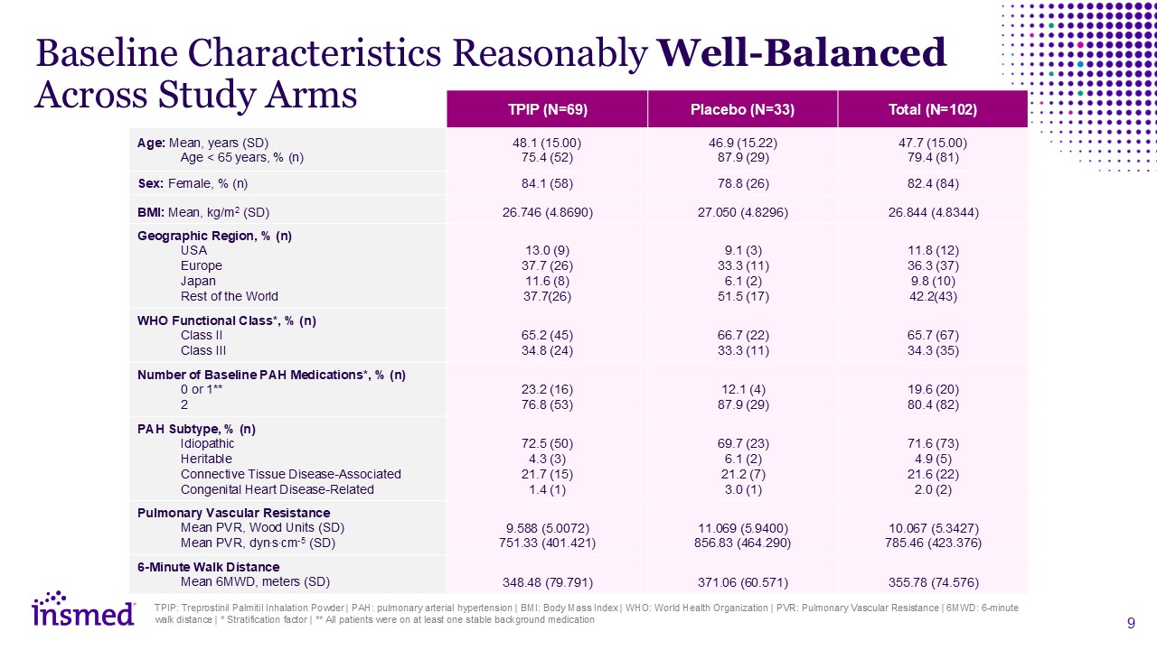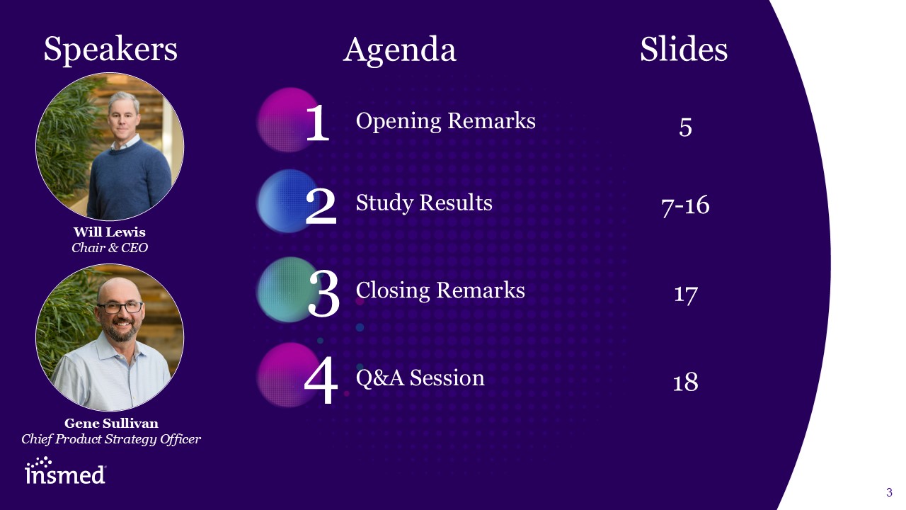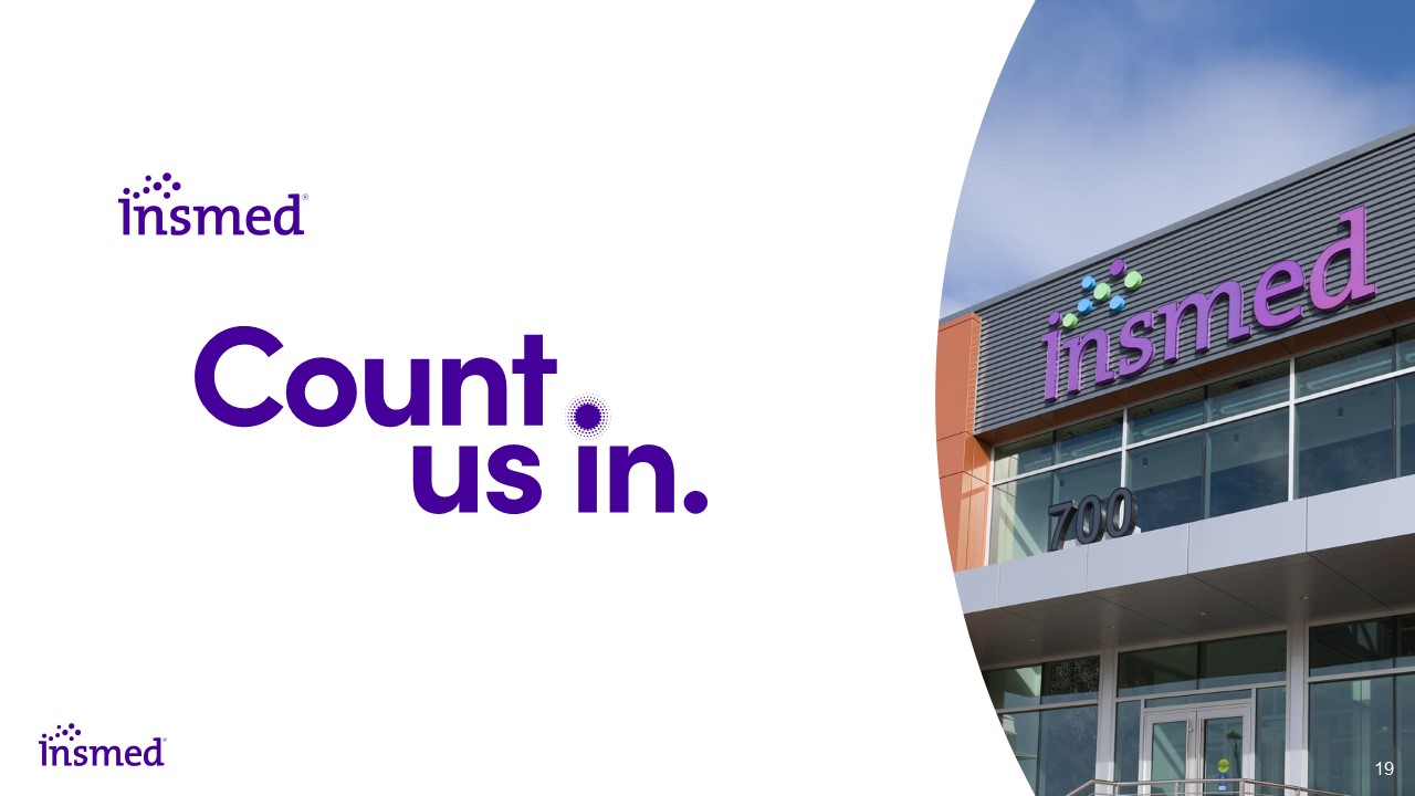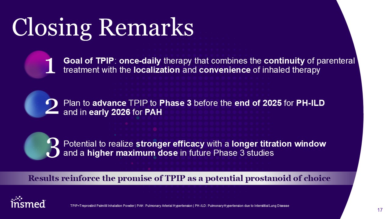 Forward Looking Statements  This presentation contains forward-looking statements that involve substantial risks and uncertainties. “Forward-looking statements,” as that term is defined in the Private Securities Litigation Reform Act of 1995, are statements that are not historical facts and involve a number of risks and uncertainties. Words herein such as “may,” “will,” “should,” “could,” “would,” “expects,” “plans,” “anticipates,” “believes,” “estimates,” “projects,” “predicts,” “intends,” “potential,” “continues,” and similar expressions (as well as other words or expressions referencing future events, conditions or circumstances) may identify forward-looking statements.  The forward-looking statements in this presentation are based upon the Company’s current expectations and beliefs, and involve known and unknown risks, uncertainties and other factors, which may cause the Company’s actual results, performance and achievements and the timing of certain events to differ materially from the results, performance, achievements or timing discussed, projected, anticipated or indicated in any forward-looking statements. Such risks, uncertainties and other factors include, among others, the following: the risk that the full data set from the TPIP PAH study or data generated in further clinical trials of TPIP will not be consistent with the topline results of the TPIP PAH study; failure to successfully conduct future clinical trials for TPIP, such as the Company’s planned Phase 3 program for TPIP, including due to the Company's potential inability to enroll or retain sufficient patients to conduct and complete the trials or generate data necessary for regulatory approval, among other things; development of unexpected safety or efficacy concerns related to TPIP; failure of third parties on which the Company is dependent to manufacture sufficient quantities of TPIP for clinical needs, to conduct the Company's clinical trials, or to comply with the Company's agreements or laws and regulations that impact the Company's business or agreements with the Company; failure to obtain regulatory approval for TPIP; inaccuracies in the Company's estimates of the size of the potential markets for TPIP or in data the Company has used to identify physicians; expected rates of patient uptake, duration of expected treatment, or expected patient adherence or discontinuation rates, if TPIP is approved; inability of the Company or the Company's third-party manufacturers to comply with regulatory requirements related to TPIP; the Company's inability to obtain adequate reimbursement from government or third-party payors for TPIP or acceptable prices for TPIP, if approved; restrictions or other obligations imposed on us by agreements related to TPIP and failure to comply with our obligations under such agreements; risks that the Company's clinical studies will be delayed or that serious side effects will be identified during drug development; the strength and enforceability of the Company’s intellectual property rights or the rights of third parties; and the cost and potential reputational damage resulting from litigation to which the Company may become a party, including product liability claims.   The Company may not actually achieve the results, plans, intentions or expectations indicated by the Company's forward-looking statements because, by their nature, forward-looking statements involve risks and uncertainties because they relate to events and depend on circumstances that may or may not occur in the future. For additional information about the risks and uncertainties that may affect the Company's business, please see the factors discussed in Item 1A, "Risk Factors," in the Company's Annual Report on Form 10-K for the year ended December 31, 2024, and any subsequent Company filings with the Securities and Exchange Commission (SEC).  The Company cautions readers not to place undue reliance on any such forward-looking statements, which speak only as of the date of this presentation. The Company disclaims any obligation, except as specifically required by law and the rules of the SEC, to publicly update or revise any such statements to reflect any change in expectations or in events, conditions or circumstances on which any such statements may be based, or that may affect the likelihood that actual results will differ from those set forth in the forward-looking statements.  Additional Disclaimers: Please be aware that TPIP is an investigational product that has not been approved for sale or found safe or effective by the FDA or any regulatory authority. This presentation is not a promotion or advertisement of TPIP. Insmed is a registered trademark of Insmed Incorporated.   TPIP: Treprostinil Palmitil Inhalation Powder | PAH: pulmonary arterial hypertension
