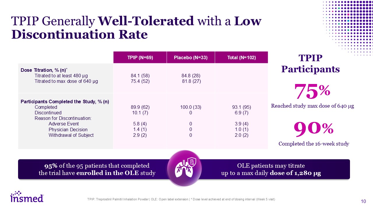 TPIP: Treprostinil Palmitil Inhalation Powder | OLE: Open label extension | * Dose level achieved at end of dosing interval (Week 5 visit)  TPIP (N=69)  Placebo (N=33)  Total (N=102)  Dose Titration, % (n)*  Titrated to at least 480 μg  Titrated to max dose of 640 μg  84.1 (58)  75.4 (52)  84.8 (28)   81.8 (27)  Participants Completed the Study, % (n)  Completed  Discontinued  Reason for Discontinuation:  Adverse Event  Physician Decision  Withdrawal of Subject  Adverse Events (%)  89.9 (62)  10.1 (7)  5.8 (4)  1.4 (1)  2.9 (2)  100.0 (33)  0   0   0   0   93.1 (95)  6.9 (7)  3.9 (4)  1.0 (1)  2.0 (2)  TPIP Generally Well-Tolerated with a Low Discontinuation Rate  75%  90%  Reached study max dose of 640 μg  Completed the 16-week study  TPIP   Participants  95% of the 95 patients that completed   the trial have enrolled in the OLE study  OLE patients may titrate   up to a max daily dose of 1,280 μg