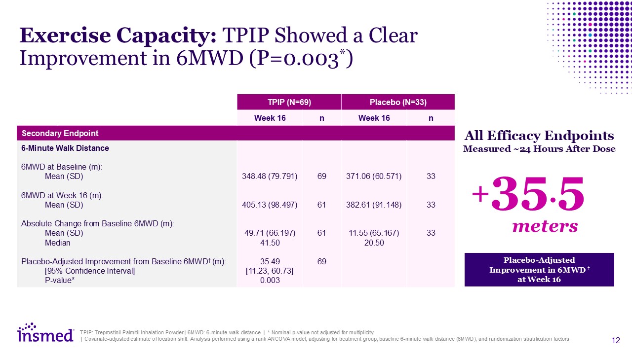 TPIP (N=69)  Placebo (N=33)  Week 16  n  Week 16  n  Secondary Endpoint  6-Minute Walk Distance  6MWD at Baseline (m):  Mean (SD)  6MWD at Week 16 (m):  Mean (SD)  Absolute Change from Baseline 6MWD (m):  Mean (SD)  Median  Placebo-Adjusted Improvement from Baseline 6MWD† (m):  [95% Confidence Interval]  P-value*  Adverse Events (%)  348.48 (79.791)  405.13 (98.497)  49.71 (66.197)  41.50  35.49  [11.23, 60.73]  0.003  69  61  61  69  371.06 (60.571)  382.61 (91.148)  11.55 (65.167)  20.50  33  33  33  Exercise Capacity: TPIP Showed a Clear Improvement in 6MWD (P=0.003*)  TPIP: Treprostinil Palmitil Inhalation Powder | 6MWD: 6-minute walk distance | * Nominal p-value not adjusted for multiplicity  † Covariate-adjusted estimate of location shift. Analysis performed using a rank ANCOVA model, adjusting for treatment group, baseline 6-minute walk distance (6MWD), and randomization stratification factors  Placebo-Adjusted   Improvement in 6MWD †  at Week 16  All Efficacy Endpoints Measured ~24 Hours After Dose  +35.5  meters