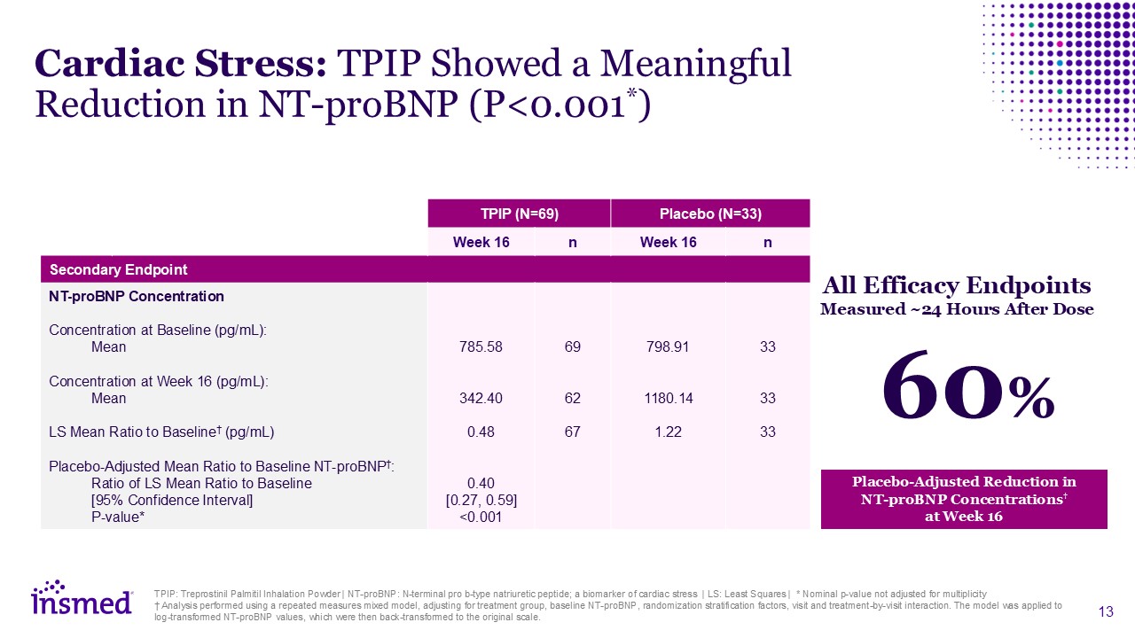 TPIP: Treprostinil Palmitil Inhalation Powder | NT-proBNP: N-terminal pro b-type natriuretic peptide; a biomarker of cardiac stress | LS: Least Squares | * Nominal p-value not adjusted for multiplicity  † Analysis performed using a repeated measures mixed model, adjusting for treatment group, baseline NT-proBNP, randomization stratification factors, visit and treatment-by-visit interaction. The model was applied to log-transformed NT-proBNP values, which were then back-transformed to the original scale.  TPIP (N=69)  Placebo (N=33)  Week 16  n  Week 16  n  Secondary Endpoint  NT-proBNP Concentration  Concentration at Baseline (pg/mL):  Mean  Concentration at Week 16 (pg/mL):  Mean  LS Mean Ratio to Baseline† (pg/mL)  Placebo-Adjusted Mean Ratio to Baseline NT-proBNP†:  Ratio of LS Mean Ratio to Baseline  [95% Confidence Interval]  P-value*  785.58  342.40  0.48  0.40  [0.27, 0.59]  <0.001  69  62  67  798.91  1180.14  1.22  33  33  33  Cardiac Stress: TPIP Showed a Meaningful Reduction in NT-proBNP (P<0.001*)  Placebo-Adjusted Reduction in  NT-proBNP Concentrations†  at Week 16   All Efficacy Endpoints Measured ~24 Hours After Dose  60%