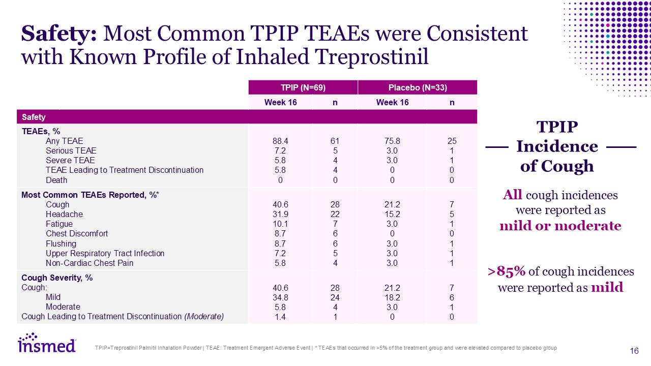 TPIP=Treprostinil Palmitil Inhalation Powder | TEAE: Treatment Emergent Adverse Event | * TEAEs that occurred in >5% of the treatment group and were elevated compared to placebo group  Safety: Most Common TPIP TEAEs were Consistent with Known Profile of Inhaled Treprostinil  TPIP (N=69)  Placebo (N=33)  Week 16  n  Week 16  n  Safety  TEAEs, %  Any TEAE  Serious TEAE  Severe TEAE  TEAE Leading to Treatment Discontinuation  Death  88.4  7.2  5.8  5.8  0  61  5  4  4  0  75.8  3.0  3.0  0  0  25  1  1  0  0  Most Common TEAEs Reported, %*  Cough  Headache  Fatigue  Chest Discomfort  Flushing  Upper Respiratory Tract Infection  Non-Cardiac Chest Pain  Adverse Events (%)  40.6  31.9  10.1  8.7  8.7  7.2  5.8  28  22  7  6  6  5  4  21.2  15.2  3.0  0  3.0  3.0  3.0  7  5  1  0  1  1  1  Cough Severity, %  Cough:  Mild  Moderate  Cough Leading to Treatment Discontinuation (Moderate)  40.6  34.8  5.8  1.4  28  24  4  1  21.2  18.2  3.0  0  7  6  1  0  All cough incidences   were reported as   mild or moderate     >85% of cough incidences were reported as mild  TPIP  Incidence   of Cough