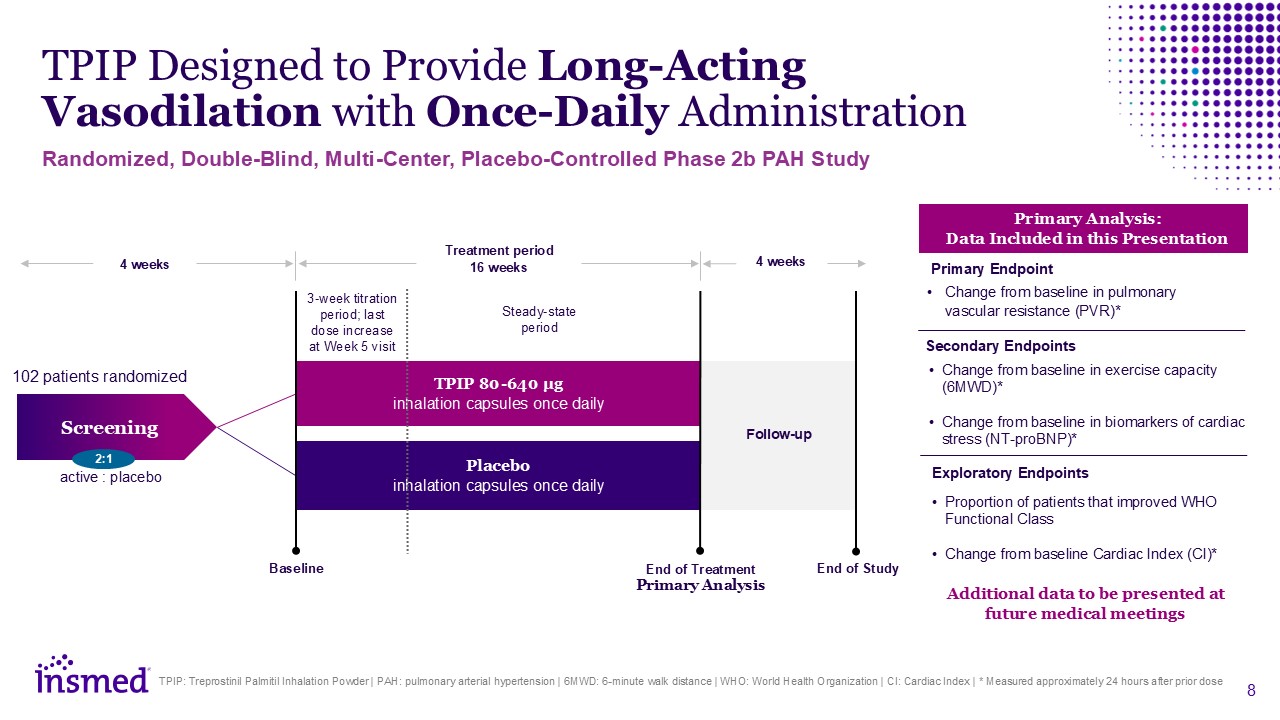 TPIP Designed to Provide Long-Acting Vasodilation with Once-Daily Administration  TPIP: Treprostinil Palmitil Inhalation Powder | PAH: pulmonary arterial hypertension | 6MWD: 6-minute walk distance | WHO: World Health Organization | CI: Cardiac Index | * Measured approximately 24 hours after prior dose   4 weeks  TPIP 80-640 µg  inhalation capsules once daily   Placebo  inhalation capsules once daily   Screening  Treatment period  16 weeks  Baseline  End of Study  4 weeks  Follow-up  102 patients randomized  Steady-state period  3-week titration period; last dose increase at Week 5 visit  active : placebo  2:1  End of Treatment  Primary Analysis  Randomized, Double-Blind, Multi-Center, Placebo-Controlled Phase 2b PAH Study  Change from baseline in pulmonary vascular resistance (PVR)*  Change from baseline in exercise capacity (6MWD)*  Change from baseline in biomarkers of cardiac stress (NT-proBNP)*  Primary Analysis:   Data Included in this Presentation  Proportion of patients that improved WHO Functional Class  Change from baseline Cardiac Index (CI)*  Primary Endpoint   Secondary Endpoints  Exploratory Endpoints  Additional data to be presented at future medical meetings