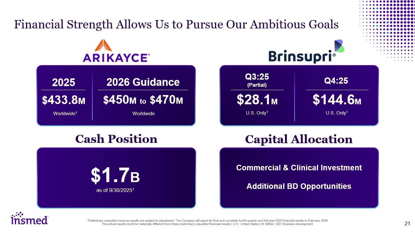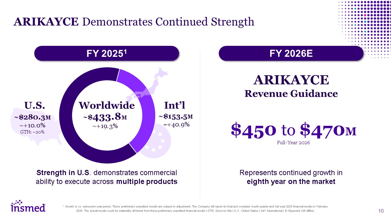 ARIKAYCE Demonstrates Continued Strength  1 Growth is vs. same prior year period; These preliminary unaudited results are subject to adjustment. The Company will report its final and complete fourth-quarter and full-year 2025 financial results in February 2026. The actual results could be materially different from these preliminary unaudited financial results | GTN: Gross-to-Net | U.S.: United States | Int’l: International | E: Expected | M: Million   Strength in U.S. demonstrates commercial ability to execute across multiple products  U.S.  ~$280.3M  ~+10.0%  GTN: ~20%  Int’l  ~$153.5M   ~+40.9%  Worldwide  ~$433.8M  ~+19.3%  FY 20251  $450 to $470M  Full-Year 2026  ARIKAYCE   Revenue Guidance   FY 2026E  Represents continued growth in eighth year on the market