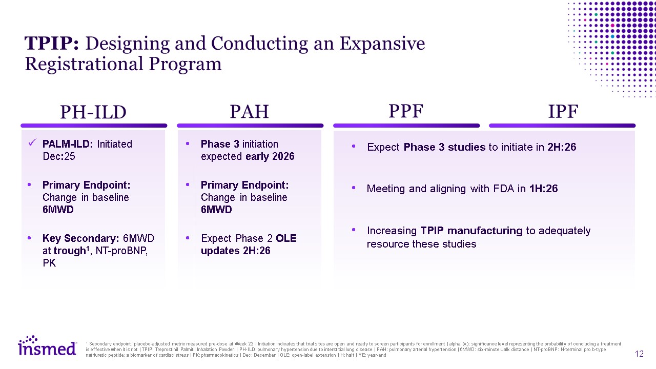 PALM-ILD: Initiated Dec:25  Primary Endpoint: Change in baseline 6MWD  Key Secondary: 6MWD at trough1, NT-proBNP, PK  Phase 3 initiation expected early 2026  Primary Endpoint: Change in baseline 6MWD  Expect Phase 2 OLE updates 2H:26  Expect Phase 3 studies to initiate in 2H:26  Meeting and aligning with FDA in 1H:26  Increasing TPIP manufacturing to adequately resource these studies  PH-ILD  PAH  PPF  IPF  TPIP: Designing and Conducting an Expansive Registrational Program  1 Secondary endpoint; placebo-adjusted metric measured pre-dose at Week 22 | Initiation indicates that trial sites are open and ready to screen participants for enrollment | alpha (α): significance level representing the probability of concluding a treatment is effective when it is not | TPIP: Treprostinil Palmitil Inhalation Powder | PH-ILD: pulmonary hypertension due to interstitial lung disease | PAH: pulmonary arterial hypertension | 6MWD: six-minute walk distance | NT-proBNP: N-terminal pro b-type natriuretic peptide; a biomarker of cardiac stress | PK: pharmacokinetics | Dec: December | OLE: open-label extension | H: half | YE: year-end