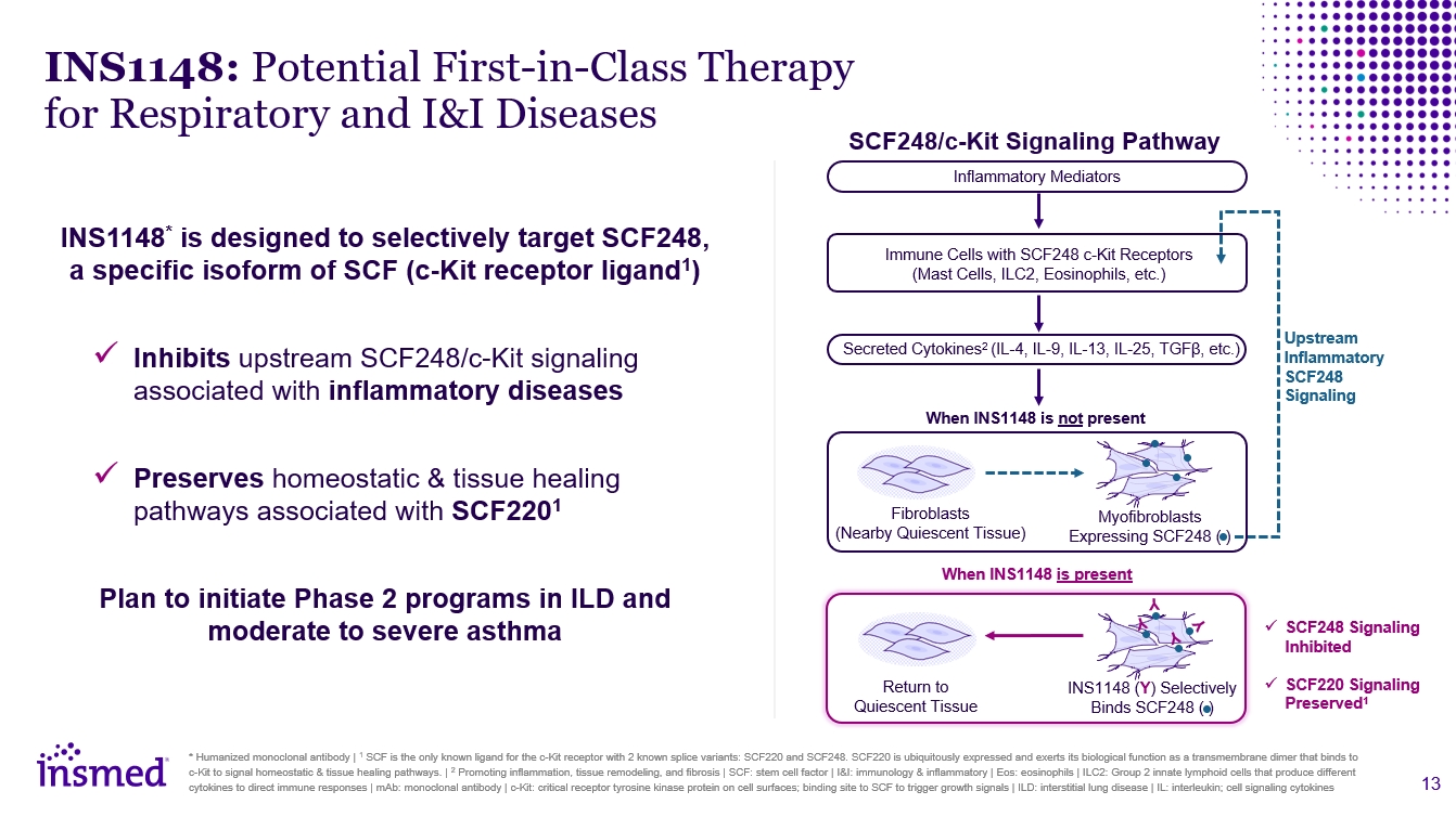 INS1148: Potential First-in-Class Therapy for Respiratory and I&I Diseases   * Humanized monoclonal antibody | 1 SCF is the only known ligand for the c-Kit receptor with 2 known splice variants: SCF220 and SCF248. SCF220 is ubiquitously expressed and exerts its biological function as a transmembrane dimer that binds to c-Kit to signal homeostatic & tissue healing pathways. | 2 Promoting inflammation, tissue remodeling, and fibrosis | SCF: stem cell factor | I&I: immunology & inflammatory | Eos: eosinophils | ILC2: Group 2 innate lymphoid cells that produce different cytokines to direct immune responses | mAb: monoclonal antibody | c-Kit: critical receptor tyrosine kinase protein on cell surfaces; binding site to SCF to trigger growth signals | ILD: interstitial lung disease | IL: interleukin; cell signaling cytokines  INS1148* is designed to selectively target SCF248, a specific isoform of SCF and a c-Kit receptor ligand1  INS1148 has the potential to…  Inhibit upstream SCF248/c-Kit signaling associated with inflammatory diseases  Preserve homeostatic & tissue healing pathways associated with SCF2201  Plan to initiate Phase 2 programs in ILD and moderate-to-severe asthma  Inflammatory Mediators  SCF248/c-Kit Signaling Pathway  Upstream Inflammatory SCF248  Signaling   Secreted Cytokines2 (IL-4, IL-9, IL-13, IL-25, TGFβ, etc.)  Immune Cells with SCF248 c-Kit Receptors  (Mast Cells, ILC2, Eosinophils, etc.)  When INS1148 is not present  When INS1148 is present  SCF248 Signaling Inhibited  SCF220 Signaling Preserved1  Return to   Quiescent Tissue  INS1148 (Y) Selectively   Binds SCF248 ( )  Y  Y  Y  Y  Fibroblasts  (Nearby Quiescent Tissue)  Myofibroblasts  Expressing SCF248 ( )