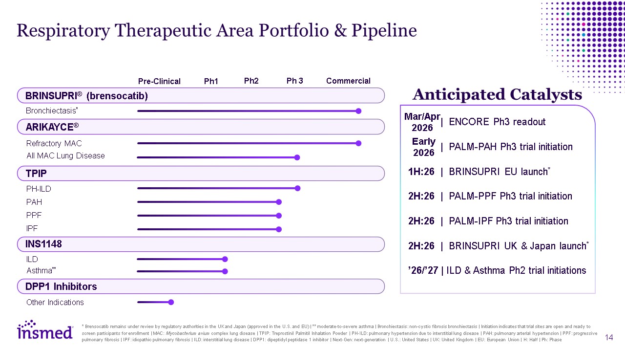 Respiratory Therapeutic Area Portfolio & Pipeline  * Brensocatib remains under review by regulatory authorities in the UK and Japan (approved in the U.S. and EU) | ** moderate-to-severe asthma | Bronchiectasis: non-cystic fibrosis bronchiectasis | Initiation indicates that trial sites are open and ready to screen participants for enrollment | MAC: Mycobacterium avium complex lung disease | TPIP: Treprostinil Palmitil Inhalation Powder | PH-ILD: pulmonary hypertension due to interstitial lung disease | PAH: pulmonary arterial hypertension | PPF: progressive pulmonary fibrosis | IPF: idiopathic pulmonary fibrosis | ILD: interstitial lung disease | DPP1: dipeptidyl peptidase 1 inhibitor | Next-Gen: next-generation | U.S.: United States | UK: United Kingdom | EU: European Union | H: Half | Ph: Phase  Anticipated Catalysts   | ENCORE Ph3 readout    | PALM-PAH Ph3 trial initiation   1H:26 | BRINSUPRI EU launch*   2H:26 | PALM-PPF Ph3 trial initiation   2H:26 | PALM-IPF Ph3 trial initiation   2H:26 | BRINSUPRI UK & Japan launch*    ’26/’27 | ILD & Asthma Ph2 trial initiations   Mar/Apr 2026   BRINSUPRI® (brensocatib)  Bronchiectasis*  Pre-Clinical  Ph1  Ph2  Ph 3  Commercial  DPP1 Inhibitors   Other Indications  TPIP   PH-ILD  PAH  PPF  IPF  INS1148  ILD  Asthma**  ARIKAYCE®  Refractory MAC  All MAC Lung Disease  Early  2026
