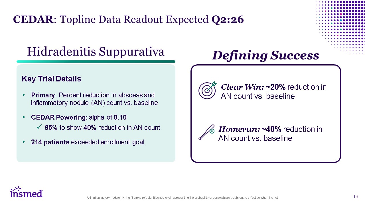 AN: inflammatory nodule | H: half | alpha (α): significance level representing the probability of concluding a treatment is effective when it is not   Hidradenitis Suppurativa  Primary: Percent reduction in abscess and inflammatory nodule (AN) count vs. baseline   CEDAR Powering: alpha of 0.10  95% to show 40% reduction in AN count   214 patients exceeded enrollment goal  CEDAR: Topline Data Readout Expected Q2:26  Defining Success  Clear Win: ~20% reduction in AN count vs. baseline  Key Trial Details  Homerun: ~40% reduction in AN count vs. baseline