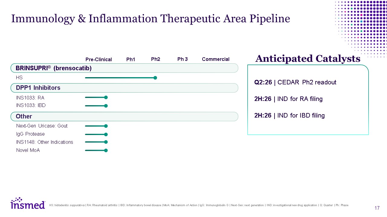 Immunology & Inflammation Therapeutic Area Pipeline  BRINSUPRI® (brensocatib)  HS  Pre-Clinical  Ph1  Ph2  Ph 3  Commercial  Other  Next-Gen Uricase: Gout  IgG Protease  INS1148: Other Indications  Novel MoA  DPP1 Inhibitors  INS1033: RA  INS1033: IBD  Anticipated Catalysts  Q2:26 | CEDAR Ph2 readout   2H:26 | IND for RA filing  2H:26 | IND for IBD filing  HS: hidradenitis suppurativa | RA: Rheumatoid arthritis | IBD: Inflammatory bowel disease | MoA: Mechanism of Action | IgG: Immunoglobulin G | Next-Gen: next generation | IND: investigational new drug application | Q: Quarter | Ph: Phase