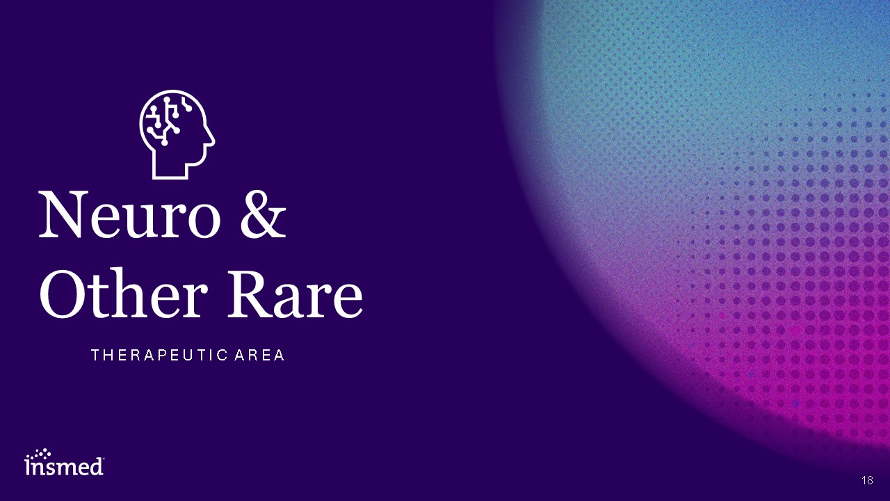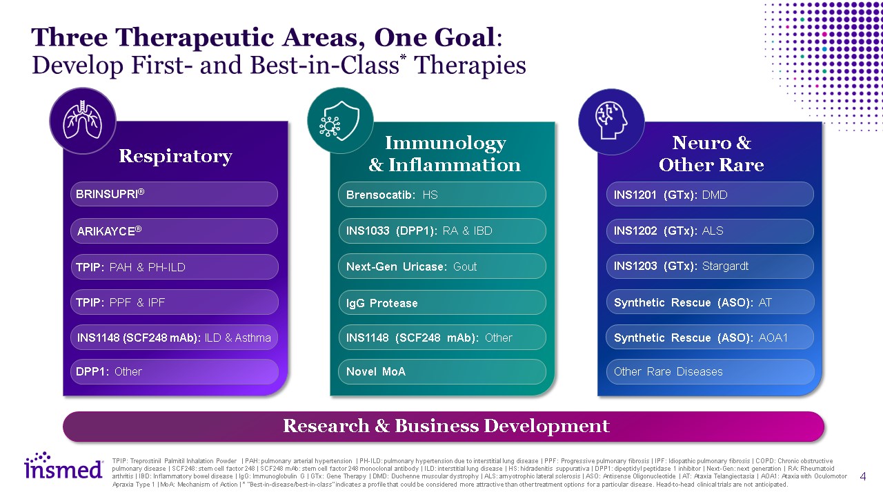 Three Therapeutic Areas, One Goal: Develop First- and Best-in-Class* Therapies  TPIP: Treprostinil Palmitil Inhalation Powder | PAH: pulmonary arterial hypertension | PH-ILD: pulmonary hypertension due to interstitial lung disease | PPF: Progressive pulmonary fibrosis | IPF: Idiopathic pulmonary fibrosis | COPD: Chronic obstructive pulmonary disease | SCF248: stem cell factor 248 | SCF248 mAb: stem cell factor 248 monoclonal antibody | ILD: interstitial lung disease | HS: hidradenitis suppurativa | DPP1: dipeptidyl peptidase 1 inhibitor | Next-Gen: next generation | RA: Rheumatoid arthritis | IBD: Inflammatory bowel disease | IgG: Immunoglobulin G | GTx: Gene Therapy | DMD: Duchenne muscular dystrophy | ALS: amyotrophic lateral sclerosis | ASO: Antisense Oligonucleotide | AT: Ataxia Telangiectasia | AOA1: Ataxia with Oculomotor Apraxia Type 1 | MoA: Mechanism of Action | * “Best-in-disease/best-in-class" indicates a profile that could be considered more attractive than other treatment options for a particular disease. Head-to-head clinical trials are not anticipated.   Respiratory  Immunology   & Inflammation  Neuro &   Other Rare  Research & Business Development  BRINSUPRI®  ARIKAYCE®   TPIP: PAH & PH-ILD  TPIP: PPF & IPF  DPP1: Other  INS1148 (SCF248 mAb): ILD & Asthma  INS1202 (GTx): ALS  INS1203 (GTx): Stargardt  Synthetic Rescue (ASO): AT  Other Rare Diseases  INS1201 (GTx): DMD  Synthetic Rescue (ASO): AOA1  Brensocatib: HS  INS1033 (DPP1): RA & IBD  Novel MoA  Next-Gen Uricase: Gout  IgG Protease  INS1148 (SCF248 mAb): Other