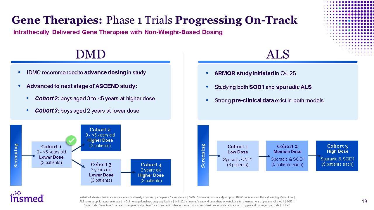 Gene Therapies: Phase 1 Trials Progressing On-Track   Initiation indicates that trial sites are open and ready to screen participants for enrollment | DMD: Duchenne muscular dystrophy | IDMC: Independent Data Monitoring Committee | ALS: amyotrophic lateral sclerosis | IND: Investigational new drug application | INS1202 is Insmed’s second gene therapy candidate for the treatment of patients with ALS | SOD1: Superoxide Dismutase 1; refers to the gene and protein for a major antioxidant enzyme that converts toxic superoxide radicals into oxygen and hydrogen peroxide | H: half  DMD  IDMC recommended to advance dosing in study  Advanced to next stage of ASCEND study:  Cohort 2: boys aged 3 to <5 years at higher dose  Cohort 3: boys aged 2 years at lower dose  ALS  ARMOR study initiated in Q4:25  Studying both SOD1 and sporadic ALS  Strong pre-clinical data exist in both models  Cohort 4  2 years old  Higher Dose  (3 patients)  Cohort 2  3 - <5 years old  Higher Dose  (3 patients)  Cohort 3  2 years old  Lower Dose  (3 patients)  Cohort 1  3 - <5 years old  Lower Dose  (3 patients)  Screening  Cohort 3  High Dose  Sporadic & SOD1  (5 patients each)  Cohort 2  Medium Dose   Sporadic & SOD1  (5 patients each)  Cohort 1  Low Dose  Sporadic ONLY  (3 patients)  Screening  Intrathecally Delivered Gene Therapies with Non-Weight-Based Dosing