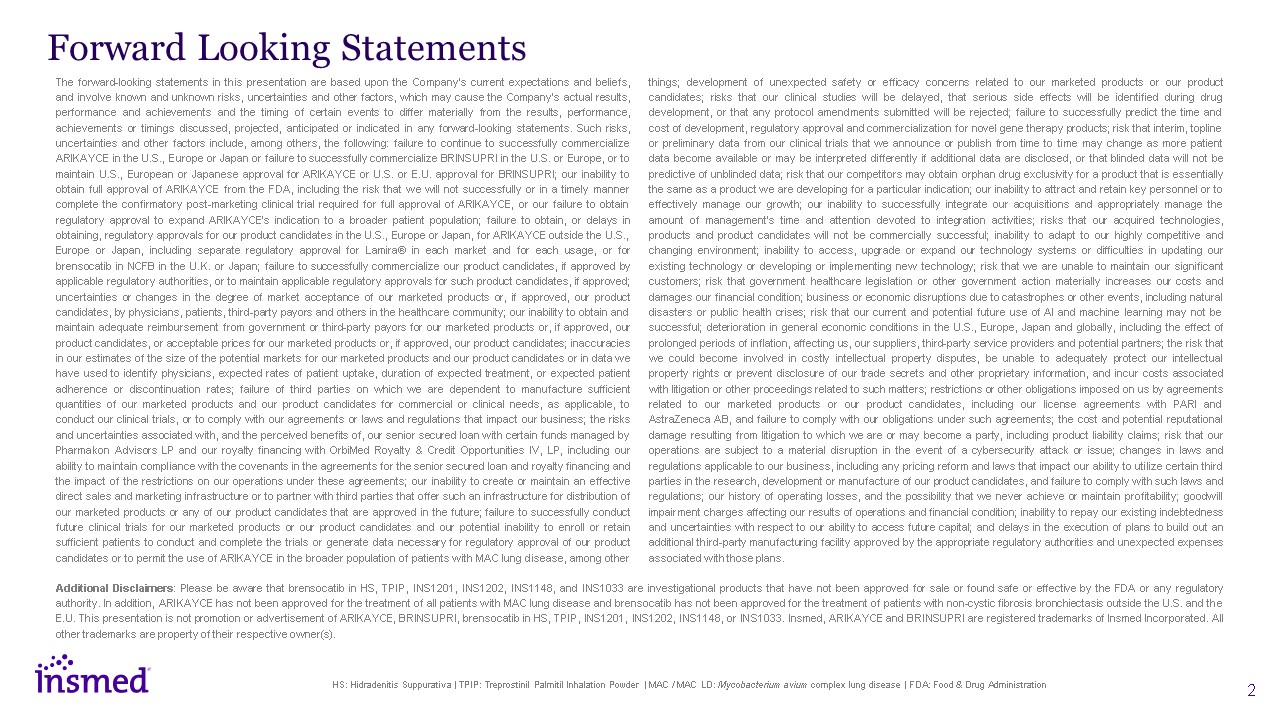 Forward Looking Statements  The forward-looking statements in this presentation are based upon the Company’s current expectations and beliefs, and involve known and unknown risks, uncertainties and other factors, which may cause the Company’s actual results, performance and achievements and the timing of certain events to differ materially from the results, performance, achievements or timings discussed, projected, anticipated or indicated in any forward-looking statements. Such risks, uncertainties and other factors include, among others, the following: failure to continue to successfully commercialize ARIKAYCE in the U.S., Europe or Japan or failure to successfully commercialize BRINSUPRI in the U.S. or Europe, or to maintain U.S., European or Japanese approval for ARIKAYCE or U.S. or E.U. approval for BRINSUPRI; our inability to obtain full approval of ARIKAYCE from the FDA, including the risk that we will not successfully or in a timely manner complete the confirmatory post-marketing clinical trial required for full approval of ARIKAYCE, or our failure to obtain regulatory approval to expand ARIKAYCE’s indication to a broader patient population; failure to obtain, or delays in obtaining, regulatory approvals for our product candidates in the U.S., Europe or Japan, for ARIKAYCE outside the U.S., Europe or Japan, including separate regulatory approval for Lamira® in each market and for each usage, or for brensocatib in NCFB in the U.K. or Japan; failure to successfully commercialize our product candidates, if approved by applicable regulatory authorities, or to maintain applicable regulatory approvals for such product candidates, if approved; uncertainties or changes in the degree of market acceptance of our marketed products or, if approved, our product candidates, by physicians, patients, third-party payors and others in the healthcare community; our inability to obtain and maintain adequate reimbursement from government or third-party payors for our marketed products or, if approved, our product candidates, or acceptable prices for our marketed products or, if approved, our product candidates; inaccuracies in our estimates of the size of the potential markets for our marketed products and our product candidates or in data we have used to identify physicians, expected rates of patient uptake, duration of expected treatment, or expected patient adherence or discontinuation rates; failure of third parties on which we are dependent to manufacture sufficient quantities of our marketed products and our product candidates for commercial or clinical needs, as applicable, to conduct our clinical trials, or to comply with our agreements or laws and regulations that impact our business; the risks and uncertainties associated with, and the perceived benefits of, our senior secured loan with certain funds managed by Pharmakon Advisors LP and our royalty financing with OrbiMed Royalty & Credit Opportunities IV, LP, including our ability to maintain compliance with the covenants in the agreements for the senior secured loan and royalty financing and the impact of the restrictions on our operations under these agreements; our inability to create or maintain an effective direct sales and marketing infrastructure or to partner with third parties that offer such an infrastructure for distribution of our marketed products or any of our product candidates that are approved in the future; failure to successfully conduct future clinical trials for our marketed products or our product candidates and our potential inability to enroll or retain sufficient patients to conduct and complete the trials or generate data necessary for regulatory approval of our product candidates or to permit the use of ARIKAYCE in the broader population of patients with MAC lung disease, among other things; development of unexpected safety or efficacy concerns related to our marketed products or our product candidates; risks that our clinical studies will be delayed, that serious side effects will be identified during drug development, or that any protocol amendments submitted will be rejected; failure to successfully predict the time and cost of development, regulatory approval and commercialization for novel gene therapy products; risk that interim, topline or preliminary data from our clinical trials that we announce or publish from time to time may change as more patient data become available or may be interpreted differently if additional data are disclosed, or that blinded data will not be predictive of unblinded data; risk that our competitors may obtain orphan drug exclusivity for a product that is essentially the same as a product we are developing for a particular indication; our inability to attract and retain key personnel or to effectively manage our growth; our inability to successfully integrate our acquisitions and appropriately manage the amount of management’s time and attention devoted to integration activities; risks that our acquired technologies, products and product candidates will not be commercially successful; inability to adapt to our highly competitive and changing environment; inability to access, upgrade or expand our technology systems or difficulties in updating our existing technology or developing or implementing new technology; risk that we are unable to maintain our significant customers; risk that government healthcare legislation or other government action materially increases our costs and damages our financial condition; business or economic disruptions due to catastrophes or other events, including natural disasters or public health crises; risk that our current and potential future use of AI and machine learning may not be successful; deterioration in general economic conditions in the U.S., Europe, Japan and globally, including the effect of prolonged periods of inflation, affecting us, our suppliers, third-party service providers and potential partners; the risk that we could