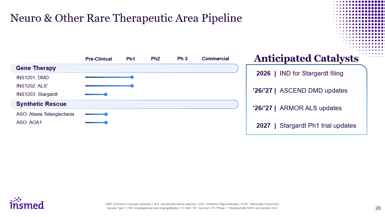 Anticipated Catalysts   2026 | IND for Stargardt filing  ’26/’27 | ASCEND DMD updates  ’26/’27 | ARMOR ALS updates   2027 | Stargardt Ph1 trial updates  Neuro & Other Rare Therapeutic Area Pipeline  Gene Therapy  INS1201: DMD  INS1202: ALS*  INS1203: Stargardt  Pre-Clinical  Ph1  Ph2  Ph 3  Commercial  Synthetic Rescue  DMD: Duchenne muscular dystrophy | ALS: amyotrophic lateral sclerosis | ASO: Antisense Oligonucleotide | AOA1: Ataxia with Oculomotor Apraxia Type 1 | IND: investigational new drug application | H: Half | YE: Year-end | Ph: Phase | * Studying both SOD1 and sporadic ALS  ASO: Ataxia Telangiectasia  ASO: AoA1