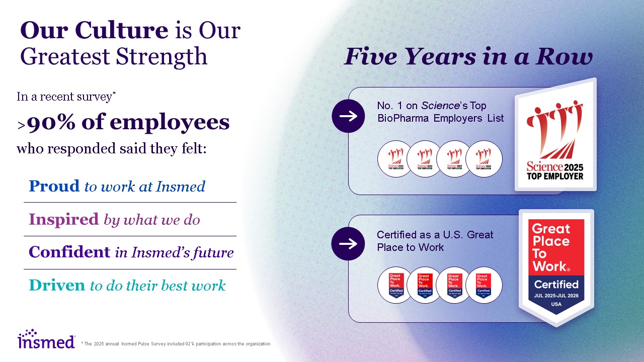 Our Culture is Our Greatest Strength  In a recent survey*  >90% of employees  who responded said they felt:  Proud to work at Insmed  Inspired by what we do  Confident in Insmed’s future  Driven to do their best work  * The 2025 annual Insmed Pulse Survey included 92% participation across the organization  Certified as a U.S. Great Place to Work  No. 1 on Science’s Top BioPharma Employers List  Five Years in a Row
