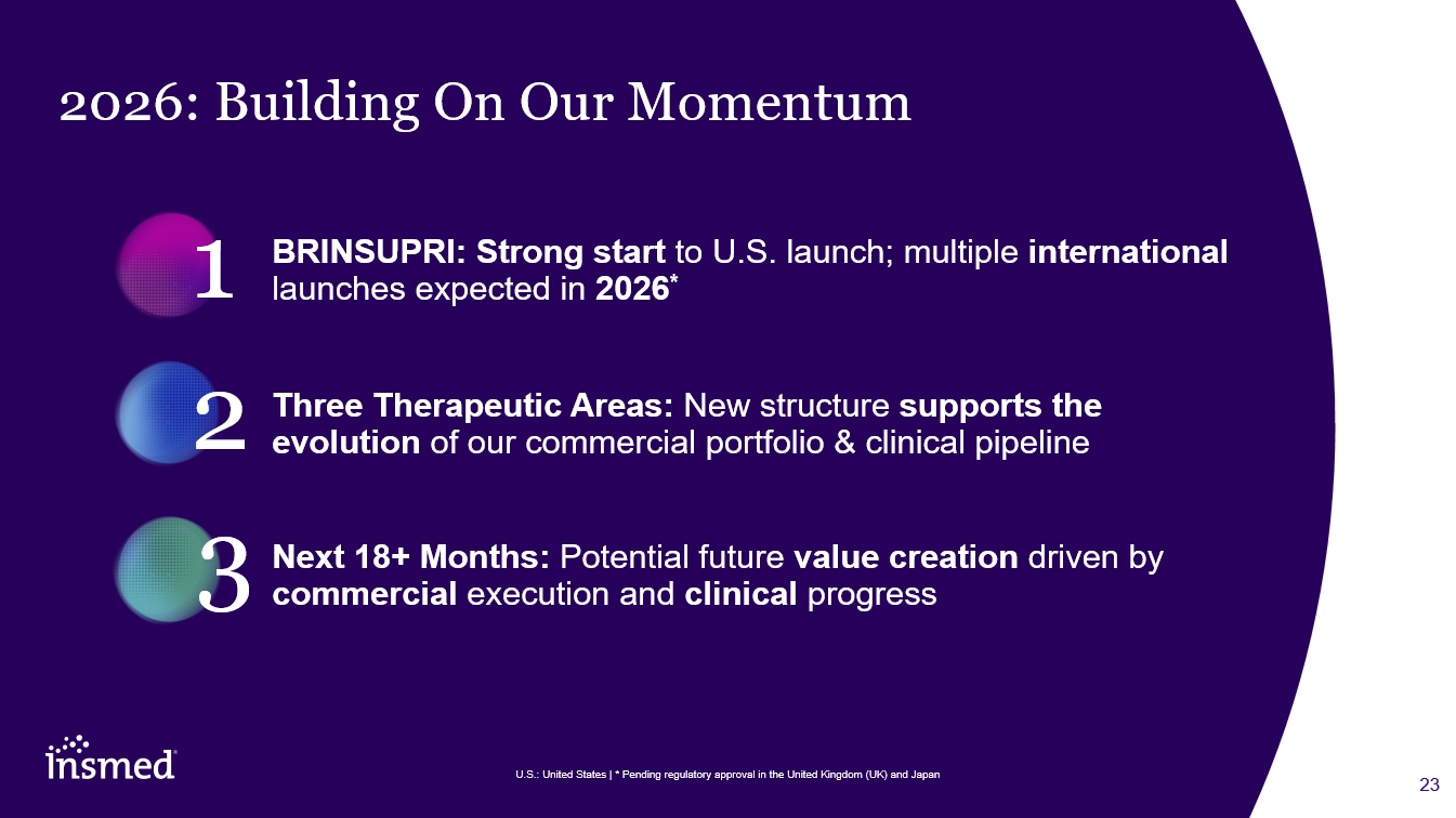 2026: Building On Our Momentum  Next 18+ Months: Potential future value creation driven by commercial execution and clinical progress  Three Therapeutic Areas: New structure supports the evolution of our commercial portfolio & clinical pipeline  BRINSUPRI: Strong start to U.S. launch; multiple international launches expected in 2026*  U.S.: United States | * Pending regulatory approval in the United Kingdom (UK) and Japan