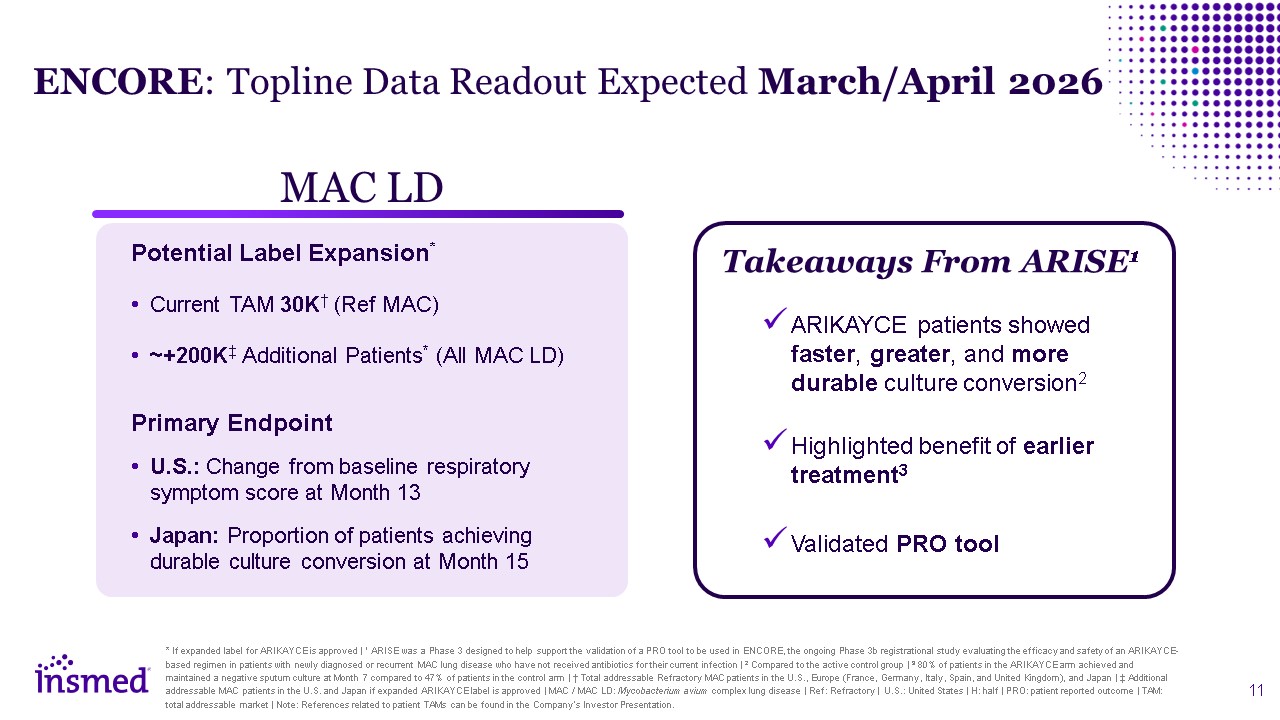 * If expanded label for ARIKAYCE is approved | 1 ARISE was a Phase 3 designed to help support the validation of a PRO tool to be used in ENCORE, the ongoing Phase 3b registrational study evaluating the efficacy and safety of an ARIKAYCE-based regimen in patients with newly diagnosed or recurrent MAC lung disease who have not received antibiotics for their current infection | 2 Compared to the active control group | 3 80% of patients in the ARIKAYCE arm achieved and maintained a negative sputum culture at Month 7 compared to 47% of patients in the control arm | † Total addressable Refractory MAC patients in the U.S., Europe (France, Germany, Italy, Spain, and United Kingdom), and Japan | ‡ Additional addressable MAC patients in the U.S. and Japan if expanded ARIKAYCE label is approved | MAC / MAC LD: Mycobacterium avium complex lung disease | Ref: Refractory | U.S.: United States | H: half | PRO: patient reported outcome | TAM: total addressable market | Note: References related to patient TAMs can be found in the Company's Investor Presentation.  ENCORE: Topline Data Readout Expected March/April 2026  MAC LD  Potential Label Expansion*  Current TAM 30K† (Ref MAC)  ~+200K‡ Additional Patients* (All MAC LD)  Primary Endpoint  U.S.: Change from baseline respiratory symptom score at Month 13  Japan: Proportion of patients achieving durable culture conversion at Month 15  ARIKAYCE patients showed faster, greater, and more durable culture conversion2  Highlighted benefit of earlier treatment3   Validated PRO tool  Takeaways From ARISE1  11