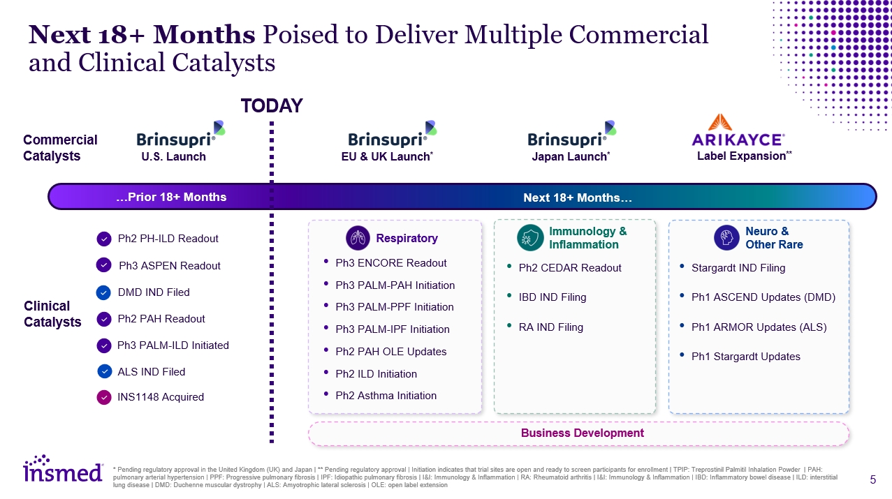 Next 18+ Months Poised to Deliver Multiple Commercial and Clinical Catalysts  * Pending regulatory approval in the United Kingdom (UK) and Japan | ** Pending regulatory approval | Initiation indicates that trial sites are open and ready to screen participants for enrollment | TPIP: Treprostinil Palmitil Inhalation Powder | PAH: pulmonary arterial hypertension | PPF: Progressive pulmonary fibrosis | IPF: Idiopathic pulmonary fibrosis | I&I: Immunology & Inflammation | RA: Rheumatoid arthritis | I&I: Immunology & Inflammation | IBD: Inflammatory bowel disease | ILD: interstitial lung disease | DMD: Duchenne muscular dystrophy | ALS: Amyotrophic lateral sclerosis | OLE: open label extension  …Prior 18+ Months  Next 18+ Months…  TODAY  Commercial  Catalysts  Clinical  Catalysts  U.S. Launch  EU & UK Launch*  Label Expansion**  Ph3 ENCORE Readout  Ph3 PALM-ILD Initiation  Ph3 PALM-PPF Initiation  Ph3 PALM-IPF Initiation  Ph2 PAH OLE Updates  Ph2 ILD Initiation   Ph2 Asthma Initiation  Respiratory   Japan Launch*  Ph2 PH-ILD Readout  Ph3 ASPEN Readout  Ph2 PAH Readout  Ph3 PALM-ILD Initiated  DMD IND Filed  ALS IND Filed  INS1148 Acquired  Immunology & Inflammation   Ph2 CEDAR Readout  IBD IND Filing  RA IND Filing  Neuro &   Other Rare  Stargardt IND Filing  Ph1 ASCEND Updates (DMD)  Ph1 ARMOR Updates (ALS)  Ph1 Stargardt Updates  Business Development