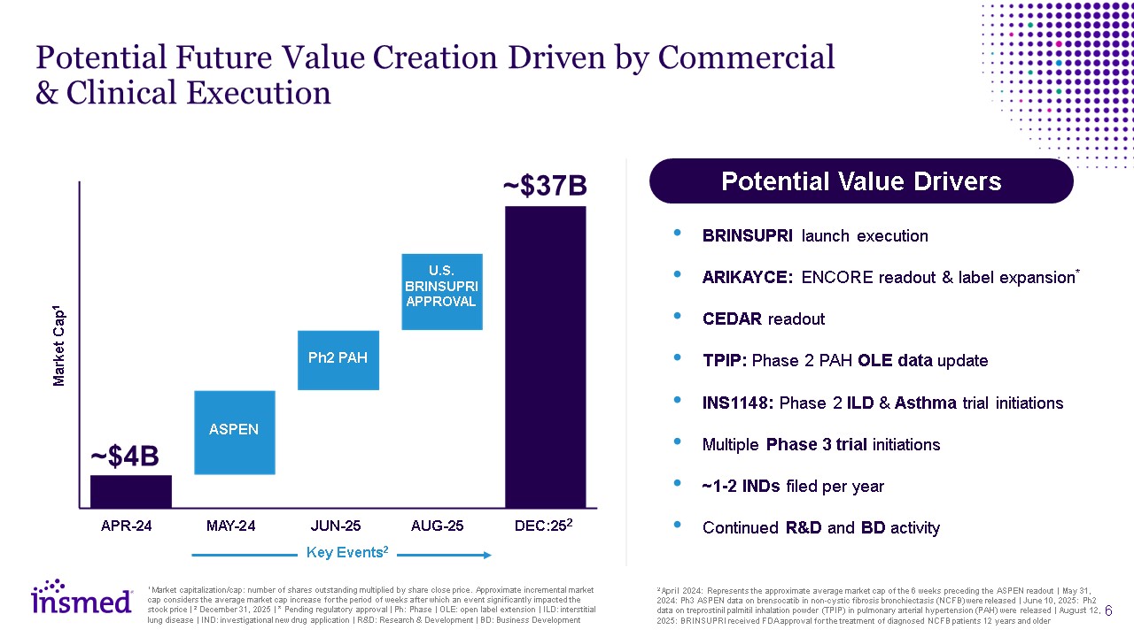 Potential Value Drivers  BRINSUPRI launch execution   ARIKAYCE: ENCORE readout & label expansion*  CEDAR readout  TPIP: Phase 2 PAH OLE data update  INS1148: Phase 2 ILD & Asthma trial initiations  Multiple Phase 3 trial initiations  ~1-2 INDs filed per year  Continued R&D and BD activity  Potential Future Value Creation Driven by Commercial & Clinical Execution  2 April 2024: Represents the approximate average market cap of the 6 weeks preceding the ASPEN readout | May 31, 2024: Ph3 ASPEN data on brensocatib in non-cystic fibrosis bronchiectasis (NCFB) were released | June 10, 2025: Ph2 data on treprostinil palmitil inhalation powder (TPIP) in pulmonary arterial hypertension (PAH) were released | August 12, 2025: BRINSUPRI received FDA approval for the treatment of diagnosed NCFB patients 12 years and older   1 Market capitalization/cap: number of shares outstanding multiplied by share close price. Approximate incremental market cap considers the average market cap increase for the period of weeks after which an event significantly impacted the stock price | 2 December 31, 2025 | * Pending regulatory approval | Ph: Phase | OLE: open label extension | ILD: interstitial lung disease | IND: investigational new drug application | R&D: Research & Development | BD: Business Development   Market Cap1  APR-24  MAY-24  JUN-25  AUG-25  DEC:252  ASPEN  Ph2 PAH  ~$37B  ~$4B  U.S.  BRINSUPRI  APPROVAL  Key Events2