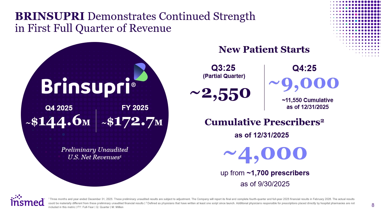 BRINSUPRI Demonstrates Continued Strength in First Full-Quarter of Revenue  Preliminary Unaudited   U.S. Net Revenues1  ~$144.6M  Q4 2025  FY 2025  ~$172.7M  New Patient Starts  Cumulative Prescribers2  ~4,000   up from ~1,700 prescribers   as of 9/30/2025  as of 12/31/2025  Q3:25  ~2,550   (Partial Quarter)  ~9,000   Q4:25  (Full Quarter)  1 Three months and year ended December 31, 2025. These preliminary unaudited results are subject to adjustment. The Company will report its final and complete fourth-quarter and full-year 2025 financial results in February 2026. The actual results could be materially different from these preliminary unaudited financial results | 2 Defined as physicians that have written at least one script since launch. Additional physicians responsible for prescriptions placed directly by hospital pharmacies are not included in this metric | FY: Full-Year | Q: Quarter | M: Million