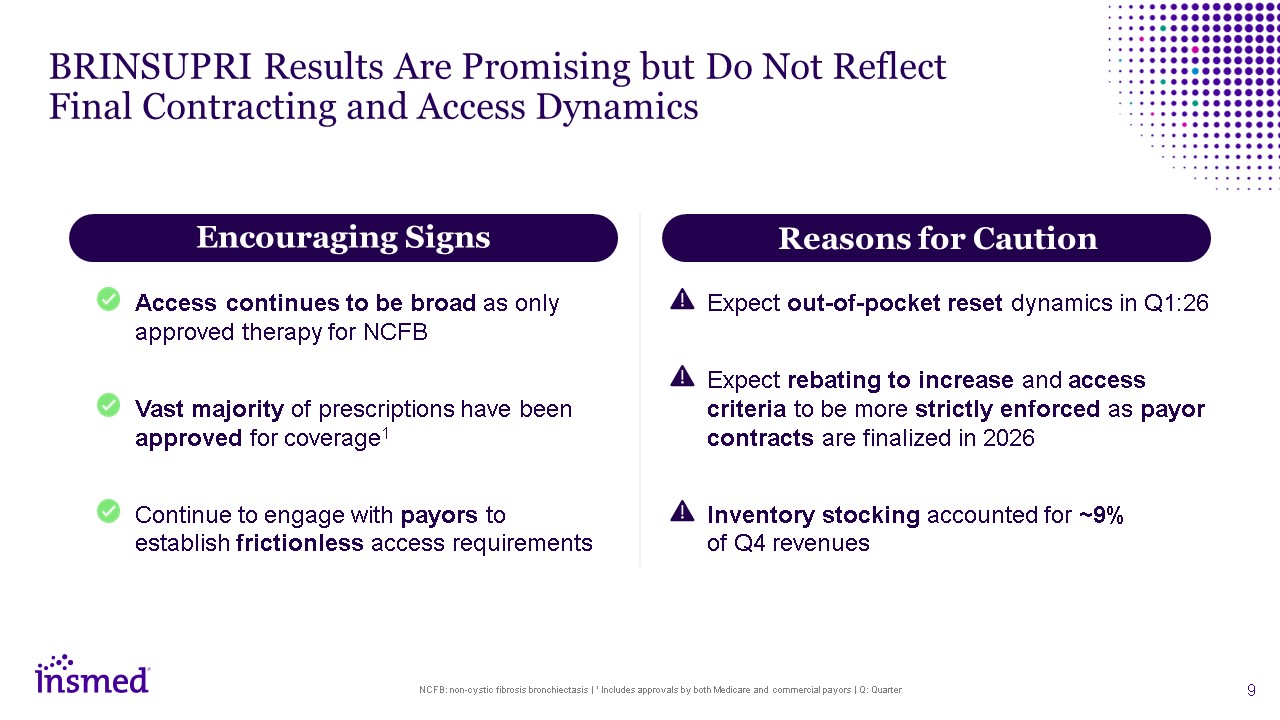 BRINSUPRI Results Are Promising but Do Not Reflect Final Contracting and Access Dynamics  NCFB: non-cystic fibrosis bronchiectasis | 1 Includes approvals by both Medicare and commercial payors | Q: Quarter  Access continues to be broad as only approved therapy for NCFB  Vast majority of prescriptions have been approved for coverage1  Continue to engage with payors to establish frictionless access requirements  Expect out-of-pocket reset dynamics in Q1:26  Expect rebating to increase and access criteria to be more strictly enforced as payor contracts are finalized in 2026  Inventory stocking accounted for ~9% of Q4 revenues  Encouraging Signs  Reasons for Caution