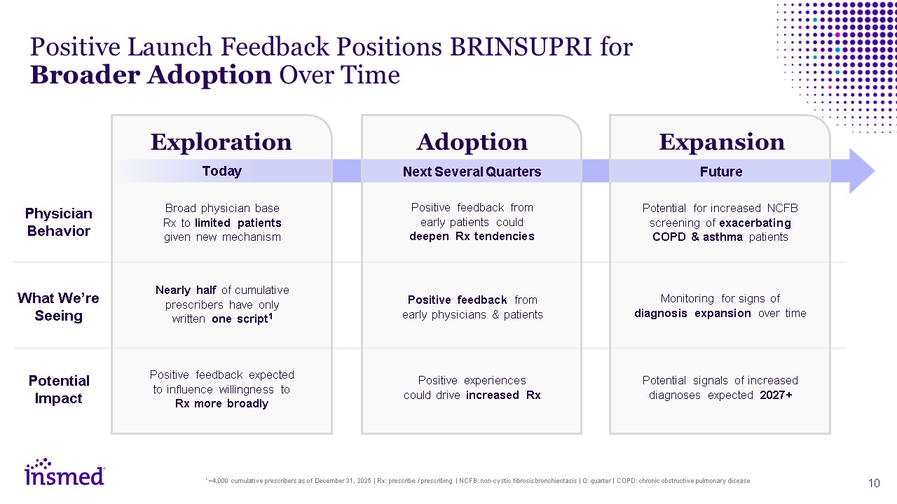 Positive Launch Feedback Positions BRINSUPRI for Broader Adoption Over Time  Physician Behavior  What We’re Seeing  Potential Impact  Potential for increased NCFB screening of exacerbating COPD & asthma patients  Expansion  Potential signals of increased diagnoses expected 2027+  Monitoring for signs of diagnosis expansion over time  Positive feedback from early patients could deepen Rx tendencies  Adoption  Positive feedback from early physicians & patients  Positive experiences could drive increased Rx  Broad physician base Rx to limited patients given new mechanism  Exploration  Nearly half of cumulative prescribers have only written one script1  Positive feedback expected to influence willingness to Rx more broadly  Today  Next Several Quarters  Future  1 ~4,000 cumulative prescribers as of December 31, 2025 | Rx: prescribe / prescribing | NCFB: non-cystic fibrosis bronchiectasis | Q: quarter | COPD: chronic obstructive pulmonary disease