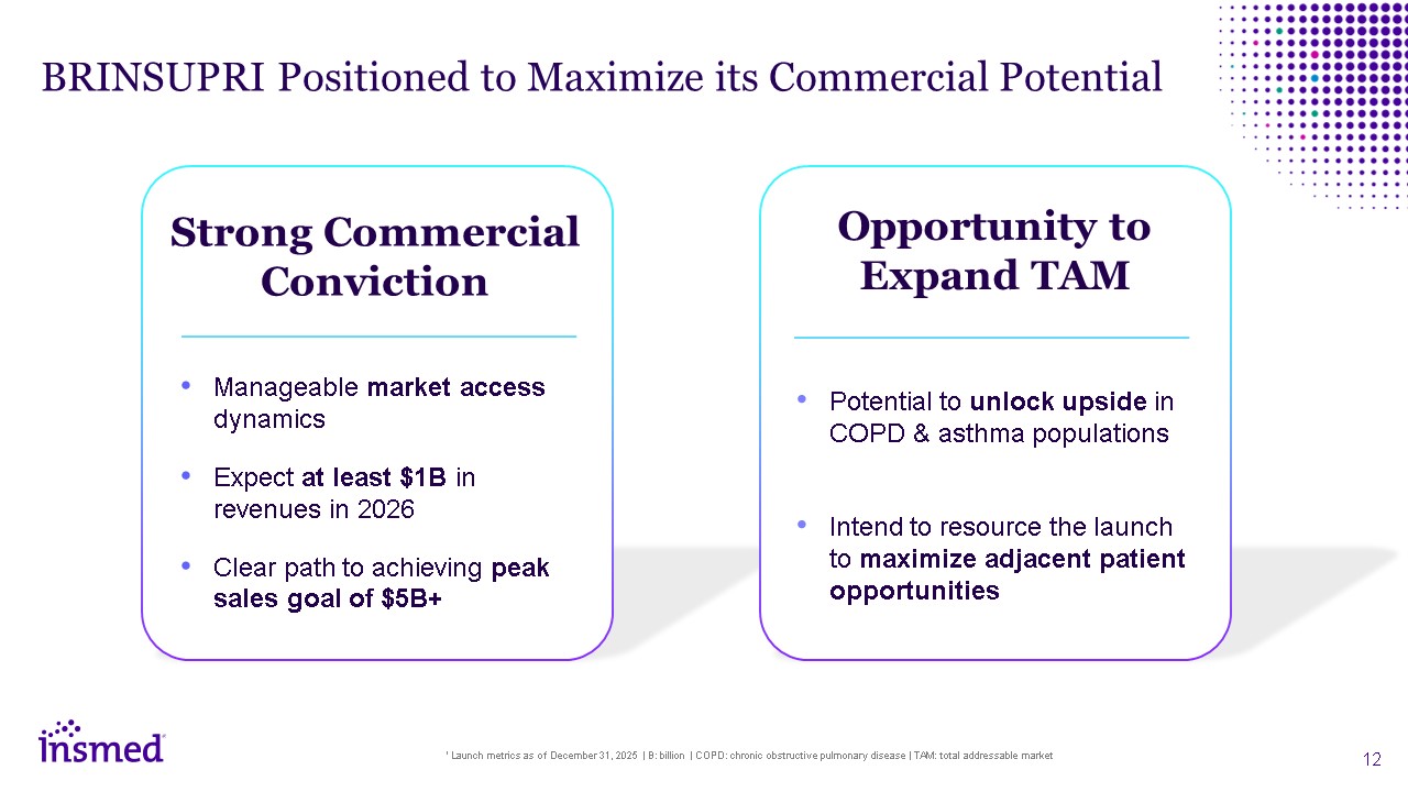 BRINSUPRI Positioned to Maximize its Commercial Potential   v  Strong Commercial Conviction  Manageable market access dynamics  Expect at least $1B in revenues in 2026  Clear path to achieving peak sales goal of $5B+  v  Opportunity to   Expand TAM  Potential to unlock upside in COPD & asthma populations  Intend to resource the launch to maximize adjacent patient opportunities  1 Launch metrics as of December 31, 2025 | B: billion | COPD: chronic obstructive pulmonary disease | TAM: total addressable market