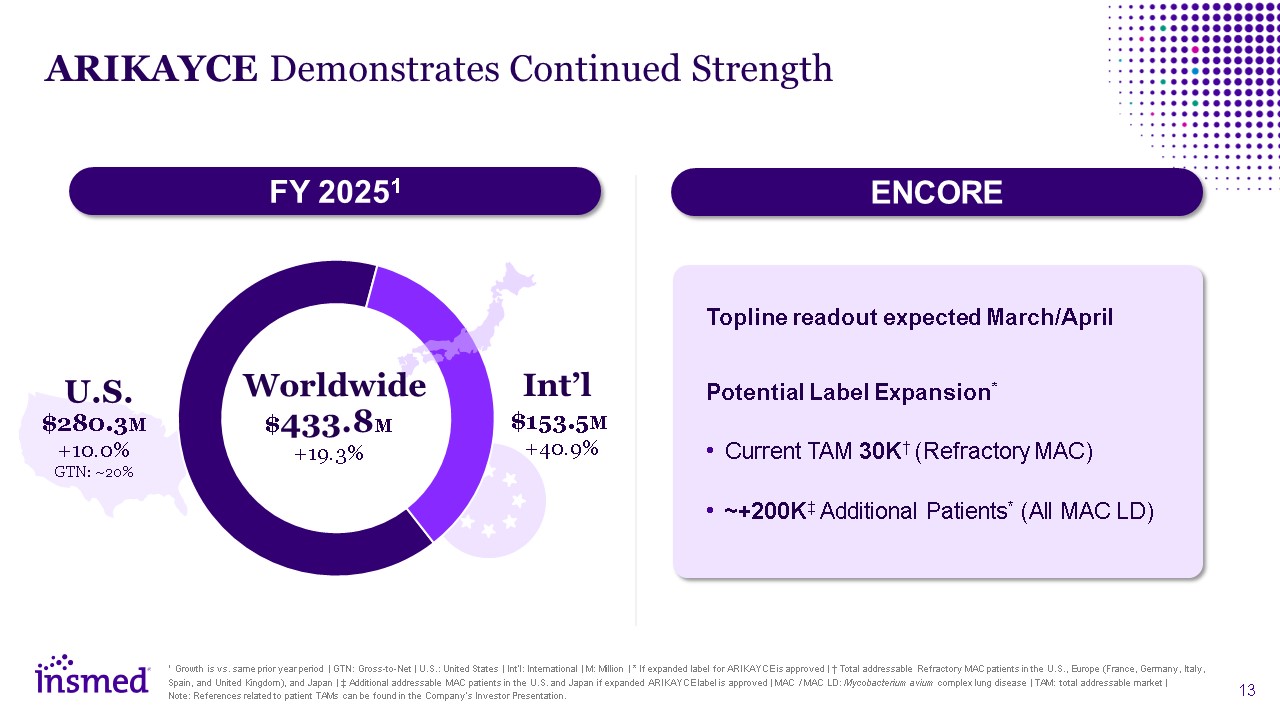 ARIKAYCE Demonstrates Continued Strength  1 Growth is vs. same prior year period | GTN: Gross-to-Net | U.S.: United States | Int’l: International | M: Million | * If expanded label for ARIKAYCE is approved | † Total addressable Refractory MAC patients in the U.S., Europe (France, Germany, Italy, Spain, and United Kingdom), and Japan | ‡ Additional addressable MAC patients in the U.S. and Japan if expanded ARIKAYCE label is approved | MAC / MAC LD: Mycobacterium avium complex lung disease | TAM: total addressable market |   Note: References related to patient TAMs can be found in the Company's Investor Presentation.   U.S.  $280.3M  +10.0%  GTN: ~20%  Int’l  $153.5M   +40.9%  FY 20251  ENCORE  Topline readout expected March/April   Potential Label Expansion*  Current TAM 30K† (Refractory MAC)  ~+200K‡ Additional Patients* (All MAC LD)  Worldwide  $433.8M  +19.3%