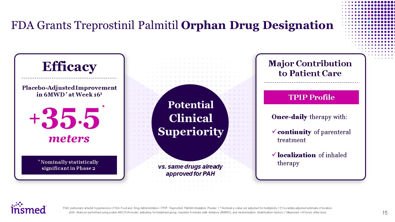 FDA Grants Treprostinil Palmitil Orphan Drug Designation  Potential   Clinical Superiority  Major Contribution   to Patient Care  Once-daily therapy with:  continuity of parenteral treatment  localization of inhaled therapy  TPIP Profile  Efficacy  Placebo-Adjusted Improvement in 6MWD † at Week 161  * Nominally statistically   significant in Phase 2  +35.5  meters  *  vs. same drugs already   approved for PAH  PAH: pulmonary arterial hypertension | FDA: Food and Drug Administration | TPIP: Treprostinil Palmitil Inhalation Powder | * Nominal p-value not adjusted for multiplicity | † Covariate-adjusted estimate of location shift. Analysis performed using a rank ANCOVA model, adjusting for treatment group, baseline 6-minute walk distance (6MWD), and randomization stratification factors | 1 Measured ~24 hours after dose