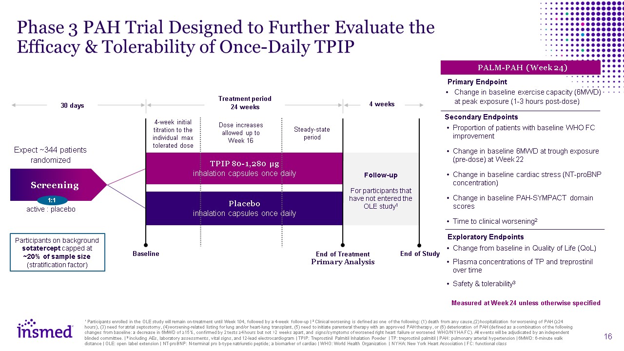 Change in baseline exercise capacity (6MWD) at peak exposure (1-3 hours post-dose)   Proportion of patients with baseline WHO FC improvement   Change in baseline 6MWD at trough exposure (pre-dose) at Week 22  Change in baseline cardiac stress (NT-proBNP concentration)  Change in baseline PAH-SYMPACT domain scores  Time to clinical worsening2  PALM-PAH (Week 24)  Change from baseline in Quality of Life (QoL)  Plasma concentrations of TP and treprostinil over time  Safety & tolerability3  Primary Endpoint   Secondary Endpoints  Exploratory Endpoints  1 Participants enrolled in the OLE study will remain on-treatment until Week 104, followed by a 4-week follow-up | 2 Clinical worsening is defined as one of the following: (1) death from any cause,(2) hospitalization for worsening of PAH (≥24 hours), (3) need for atrial septostomy, (4) worsening-related listing for lung and/or heart-lung transplant, (5) need to initiate parenteral therapy with an approved PAH therapy, or (6) deterioration of PAH (defined as a combination of the following changes from baseline: a decrease in 6MWD of ≥15%, confirmed by 2 tests ≥4 hours but not >2 weeks apart, and signs/symptoms of worsened right heart failure or worsened WHO/NYHA FC). All events will be adjudicated by an independent blinded committee. | 3 including AEs, laboratory assessments, vital signs, and 12-lead electrocardiogram | TPIP: Treprostinil Palmitil Inhalation Powder | TP: treprostinil palmitil | PAH: pulmonary arterial hypertension | 6MWD: 6-minute walk distance | OLE: open label extension | NT-proBNP: N-terminal pro b-type natriuretic peptide; a biomarker of cardiac | WHO: World Health Organization | NYHA: New York Heart Association | FC: functional class  4 weeks  TPIP 80-1,280 µg  inhalation capsules once daily   Placebo  inhalation capsules once daily   Screening  Treatment period  24 weeks  Baseline  End of Study  30 days  Follow-up  For participants that have not entered the OLE study1  Expect ~344 patients randomized  Steady-state   period  4-week initial titration to the individual max tolerated dose  active : placebo  1:1  End of Treatment  Primary Analysis  Dose increases allowed up to Week 16  Participants on background sotatercept capped at ~20% of sample size (stratification factor)  Phase 3 PAH Trial Designed to Further Evaluate the Efficacy & Tolerability of Once-Daily TPIP  Measured at Week 24 unless otherwise specified