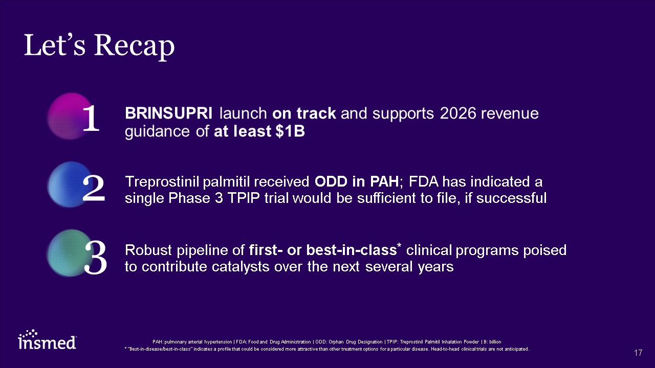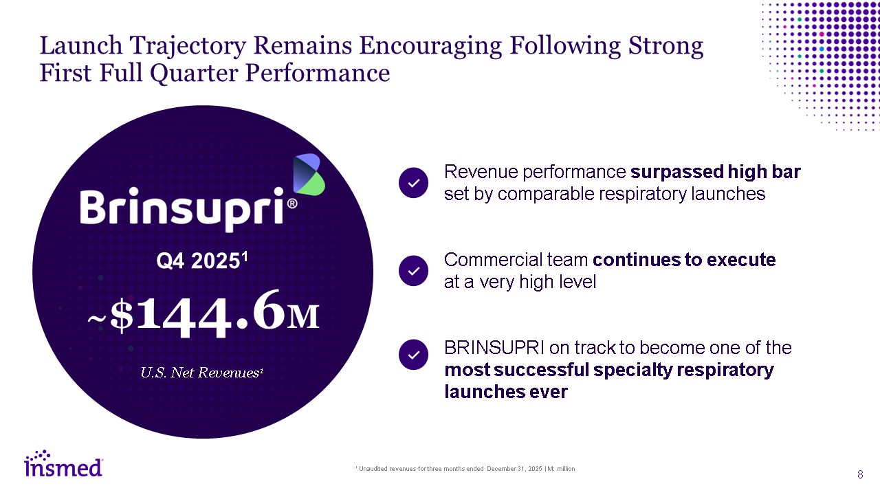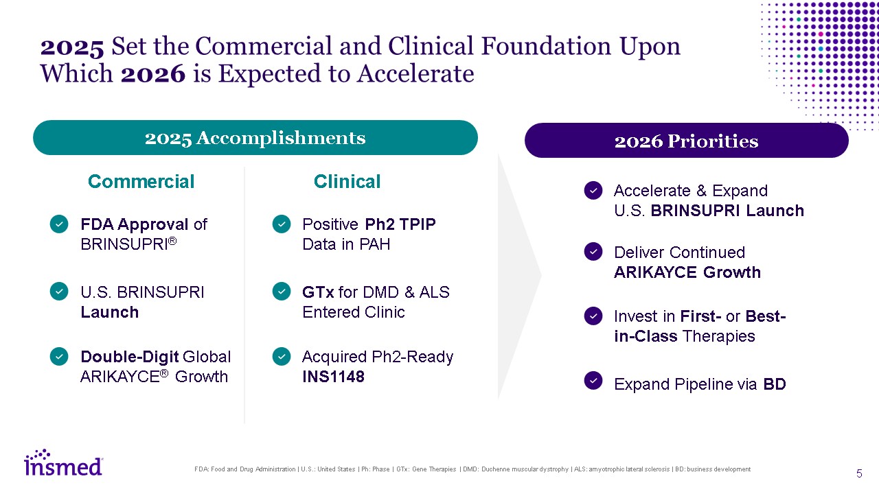 2025 Set the Commercial and Clinical Foundation Upon Which 2026 is Expected to Accelerate  2025 Accomplishments  Commercial  Clinical  FDA Approval of BRINSUPRI®  U.S. BRINSUPRI Launch  Double-Digit Global ARIKAYCE® Growth  Positive Ph2 TPIP Data in PAH  GTx for DMD & ALS Entered Clinic  Acquired Ph2-Ready INS1148  2026 Priorities  Accelerate & Expand   U.S. BRINSUPRI Launch  Deliver Continued ARIKAYCE Growth  Invest in First- or Best-in-Class Therapies  Expand Pipeline via BD  FDA: Food and Drug Administration | U.S.: United States | Ph: Phase | GTx: Gene Therapies | DMD: Duchenne muscular dystrophy | ALS: amyotrophic lateral sclerosis | BD: business development