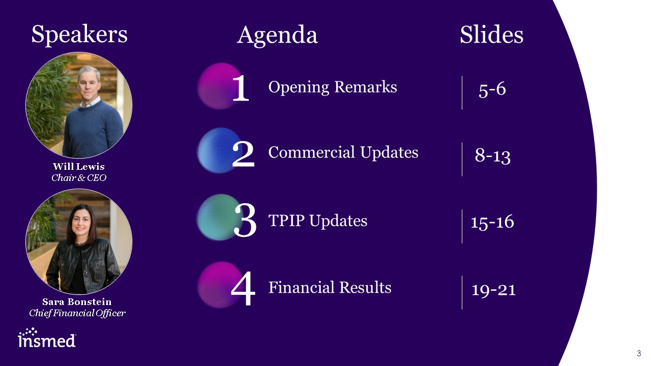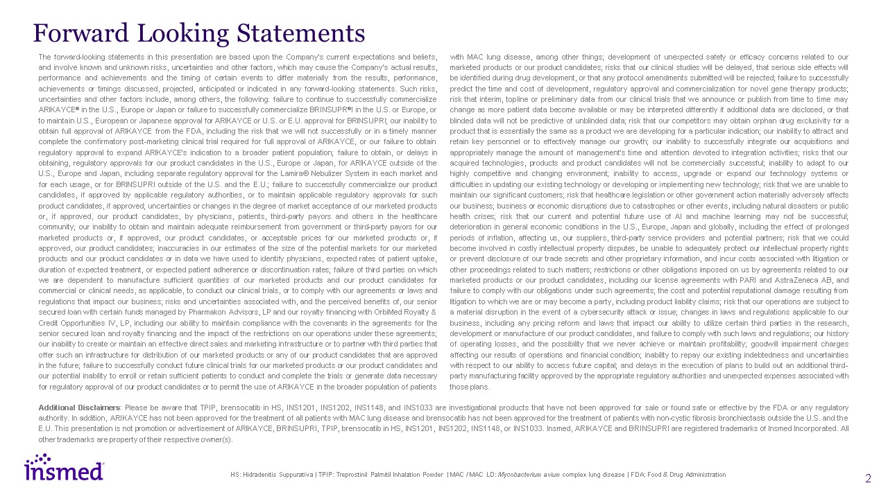 Forward Looking Statements  The forward-looking statements in this presentation are based upon the Company’s current expectations and beliefs, and involve known and unknown risks, uncertainties and other factors, which may cause the Company’s actual results, performance and achievements and the timing of certain events to differ materially from the results, performance, achievements or timings discussed, projected, anticipated or indicated in any forward-looking statements. Such risks, uncertainties and other factors include, among others, the following: failure to continue to successfully commercialize ARIKAYCE® in the U.S., Europe or Japan or failure to successfully commercialize BRINSUPR®I in the U.S. or Europe, or to maintain U.S., European or Japanese approval for ARIKAYCE or U.S. or E.U. approval for BRINSUPRI; our inability to obtain full approval of ARIKAYCE from the FDA, including the risk that we will not successfully or in a timely manner complete the confirmatory post-marketing clinical trial required for full approval of ARIKAYCE, or our failure to obtain regulatory approval to expand ARIKAYCE’s indication to a broader patient population; failure to obtain, or delays in obtaining, regulatory approvals for our product candidates in the U.S., Europe or Japan, for ARIKAYCE outside of the U.S., Europe and Japan, including separate regulatory approval for the Lamira® Nebulizer System in each market and for each usage, or for BRINSUPRI outside of the U.S. and the E.U.; failure to successfully commercialize our product candidates, if approved by applicable regulatory authorities, or to maintain applicable regulatory approvals for such product candidates, if approved; uncertainties or changes in the degree of market acceptance of our marketed products or, if approved, our product candidates, by physicians, patients, third-party payors and others in the healthcare community; our inability to obtain and maintain adequate reimbursement from government or third-party payors for our marketed products or, if approved, our product candidates, or acceptable prices for our marketed products or, if approved, our product candidates; inaccuracies in our estimates of the size of the potential markets for our marketed products and our product candidates or in data we have used to identify physicians, expected rates of patient uptake, duration of expected treatment, or expected patient adherence or discontinuation rates; failure of third parties on which we are dependent to manufacture sufficient quantities of our marketed products and our product candidates for commercial or clinical needs, as applicable, to conduct our clinical trials, or to comply with our agreements or laws and regulations that impact our business; risks and uncertainties associated with, and the perceived benefits of, our senior secured loan with certain funds managed by Pharmakon Advisors, LP and our royalty financing with OrbiMed Royalty & Credit Opportunities IV, LP, including our ability to maintain compliance with the covenants in the agreements for the senior secured loan and royalty financing and the impact of the restrictions on our operations under these agreements; our inability to create or maintain an effective direct sales and marketing infrastructure or to partner with third parties that offer such an infrastructure for distribution of our marketed products or any of our product candidates that are approved in the future; failure to successfully conduct future clinical trials for our marketed products or our product candidates and our potential inability to enroll or retain sufficient patients to conduct and complete the trials or generate data necessary for regulatory approval of our product candidates or to permit the use of ARIKAYCE in the broader population of patients with MAC lung disease, among other things; development of unexpected safety or efficacy concerns related to our marketed products or our product candidates; risks that our clinical studies will be delayed, that serious side effects will be identified during drug development, or that any protocol amendments submitted will be rejected; failure to successfully predict the time and cost of development, regulatory approval and commercialization for novel gene therapy products; risk that interim, topline or preliminary data from our clinical trials that we announce or publish from time to time may change as more patient data become available or may be interpreted differently if additional data are disclosed, or that blinded data will not be predictive of unblinded data; risk that our competitors may obtain orphan drug exclusivity for a product that is essentially the same as a product we are developing for a particular indication; our inability to attract and retain key personnel or to effectively manage our growth; our inability to successfully integrate our acquisitions and appropriately manage the amount of management’s time and attention devoted to integration activities; risks that our acquired technologies, products and product candidates will not be commercially successful; inability to adapt to our highly competitive and changing environment; inability to access, upgrade or expand our technology systems or difficulties in updating our existing technology or developing or implementing new technology; risk that we are unable to maintain our significant customers; risk that healthcare legislation or other government action materially adversely affects our business; business or economic disruptions due to catastrophes or other events, including natural disasters or public health crises; risk that our current and potential future use of AI and machine learning may not be successful; deterioration in general economic conditions in the U.S., Europe, Japan and globally, including the effect of prolonged periods of inflation, affecting us, our suppliers, third-party service providers and potential partners; risk that we could become invo