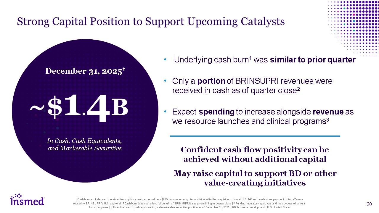 Strong Capital Position to Support Upcoming Catalysts  1 Cash burn excludes cash received from option exercises as well as ~$70M in non-recurring items attributed to the acquisition of asset INS1148 and a milestone payment to AstraZeneca related to BRINSUPRI’s U.S. approval | 2 Cash burn does not reflect full benefit of BRINSUPRI sales given timing of quarter close | 3 Pending regulatory approvals and the success of current clinical programs | † Unaudited cash, cash equivalents, and marketable securities position as of December 31, 2025 | BD: business development | U.S.: United States  ~$1.4B  December 31, 2025†  In Cash, Cash Equivalents,   and Marketable Securities   Underlying cash burn1 was similar to prior quarter  Only a portion of BRINSUPRI revenues were received in cash as of quarter close2  Expect spending to increase alongside revenue as we resource launches and clinical programs3  Confident cash flow positivity can be achieved without additional capital   May raise capital to support BD or other value-creating initiatives