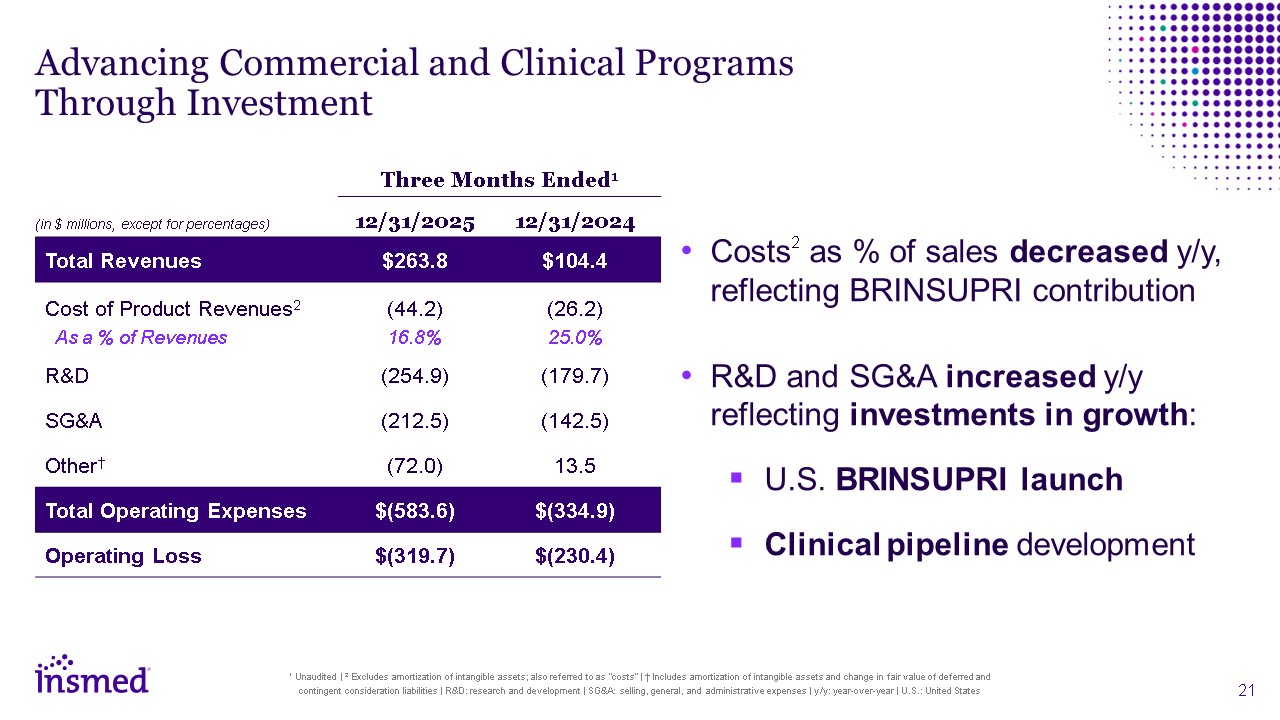 Advancing Commercial and Clinical Programs Through Investment  Three Months Ended1  12/31/2025  12/31/2024  Total Revenues  $263.8  $104.4  Cost of Product Revenues2   As a % of Revenues  (44.2)  16.8%  (26.2)  25.0%  R&D  (254.9)  (179.7)  SG&A  (212.5)  (142.5)  Other†  (72.0)  13.5  Total Operating Expenses  $(583.6)  $(334.9)  Operating Loss  $(319.7)  $(230.4)  Costs2 as % of sales decreased y/y, reflecting BRINSUPRI contribution  R&D and SG&A increased y/y reflecting investments in growth:  U.S. BRINSUPRI launch  Clinical pipeline development  1 Unaudited | 2 Excludes amortization of intangible assets; also referred to as “costs” | † Includes amortization of intangible assets and change in fair value of deferred and contingent consideration liabilities | R&D: research and development | SG&A: selling, general, and administrative expenses | y/y: year-over-year | U.S.: United States  (in $ millions, except for percentages)