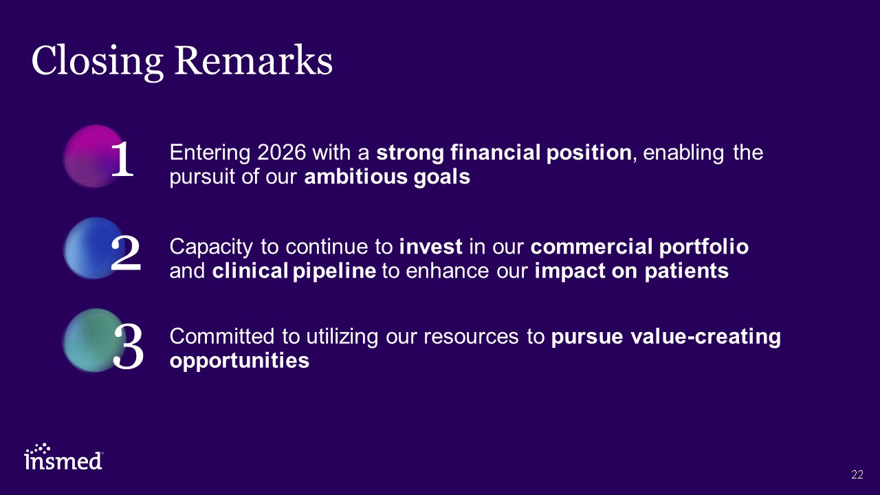 Closing Remarks  Entering 2026 with a strong financial position, enabling the pursuit of our ambitious goals  Committed to utilizing our resources to pursue value-creating opportunities  Capacity to continue to invest in our commercial portfolio and clinical pipeline to enhance our impact on patients