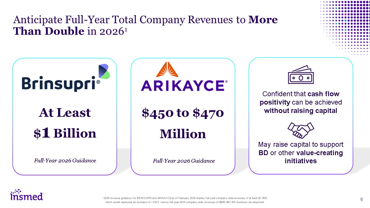 Anticipate Full-Year Total Company Revenues to More Than Double in 20261  At Least   $1 Billion  Full-Year 2026 Guidance  $450 to $470  Million  Full-Year 2026 Guidance  1 2026 revenue guidance for BRINSUPRI and ARIKAYCE as of February 2026 implies full-year company-wide revenues of at least $1.45B, which would represent an increase of ~139% versus full-year 2025 company-wide revenues of $606.4M | BD: business development  Confident that cash flow positivity can be achieved without raising capital   May raise capital to support BD or other value-creating initiatives