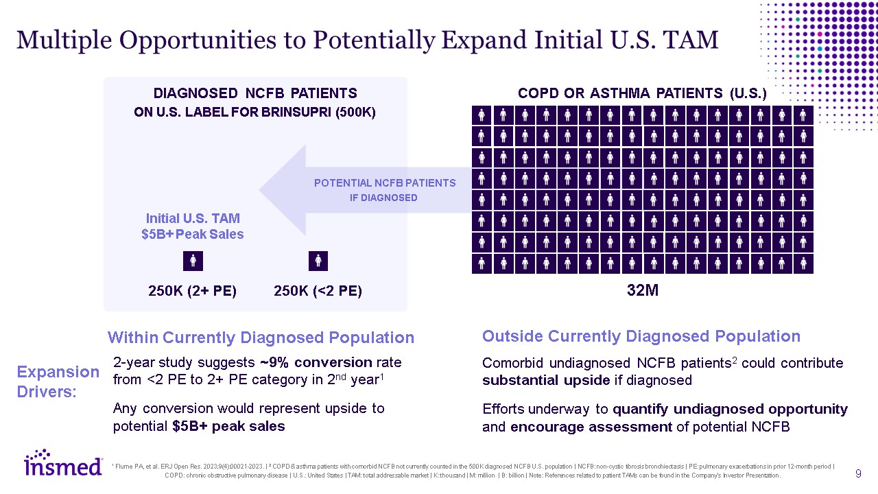 DIAGNOSED NCFB PATIENTS   ON U.S. LABEL FOR BRINSUPRI (500K)  250K (2+ PE)  250K (<2 PE)  Initial U.S. TAM  $5B+ Peak Sales  Multiple Opportunities to Potentially Expand Initial U.S. TAM  1 Flume PA, et al. ERJ Open Res. 2023;9(4):00021-2023. | 2 COPD & asthma patients with comorbid NCFB not currently counted in the 500K diagnosed NCFB U.S. population | NCFB: non-cystic fibrosis bronchiectasis | PE: pulmonary exacerbations in prior 12-month period | COPD: chronic obstructive pulmonary disease | U.S.: United States | TAM: total addressable market | K: thousand | M: million | B: billion | Note: References related to patient TAMs can be found in the Company's Investor Presentation.   Outside Currently Diagnosed Population  Comorbid undiagnosed NCFB patients2 could contribute substantial upside if diagnosed  Efforts underway to quantify undiagnosed opportunity and encourage assessment of potential NCFB  Within Currently Diagnosed Population  2-year study suggests ~9% conversion rate from <2 PE to 2+ PE category in 2nd year1  Any conversion would represent upside to potential $5B+ peak sales  Expansion Drivers:  COPD OR ASTHMA PATIENTS (U.S.)  32M   POTENTIAL NCFB PATIENTS  IF DIAGNOSED
