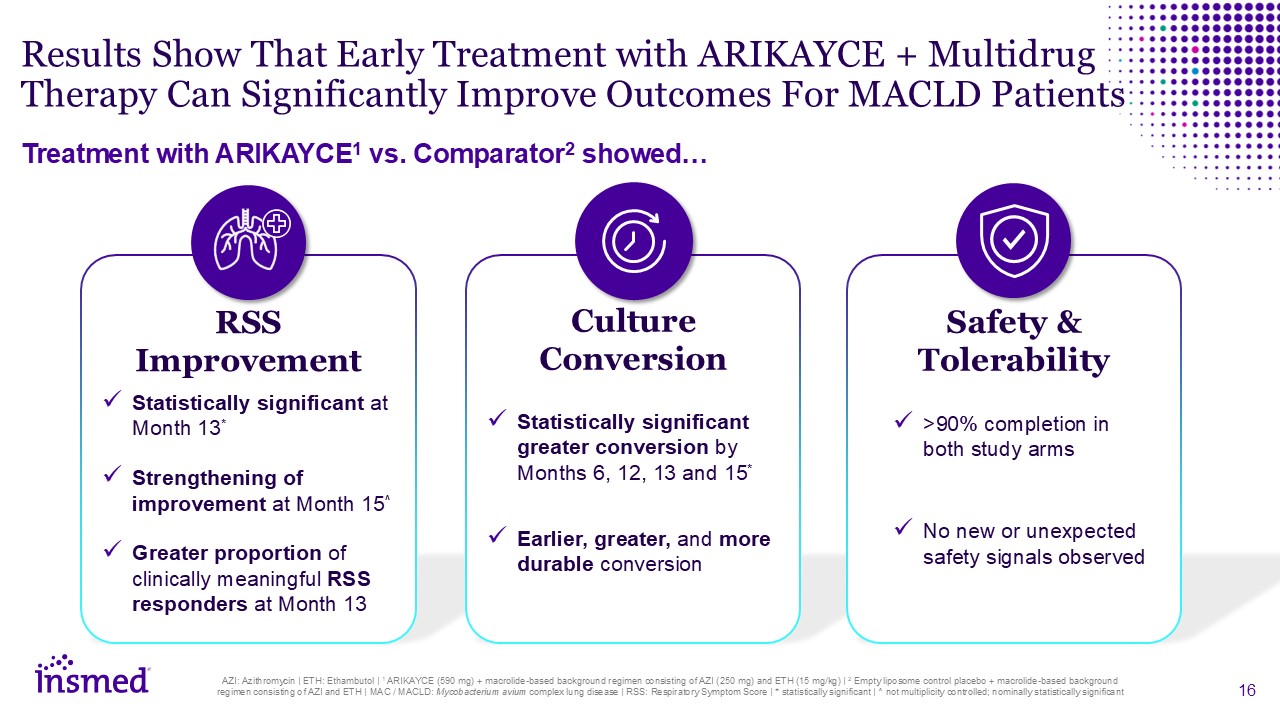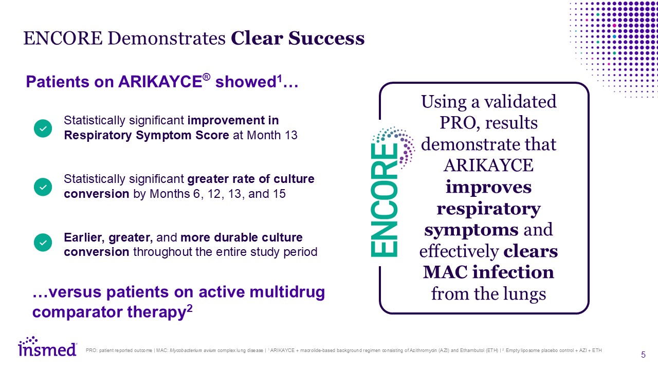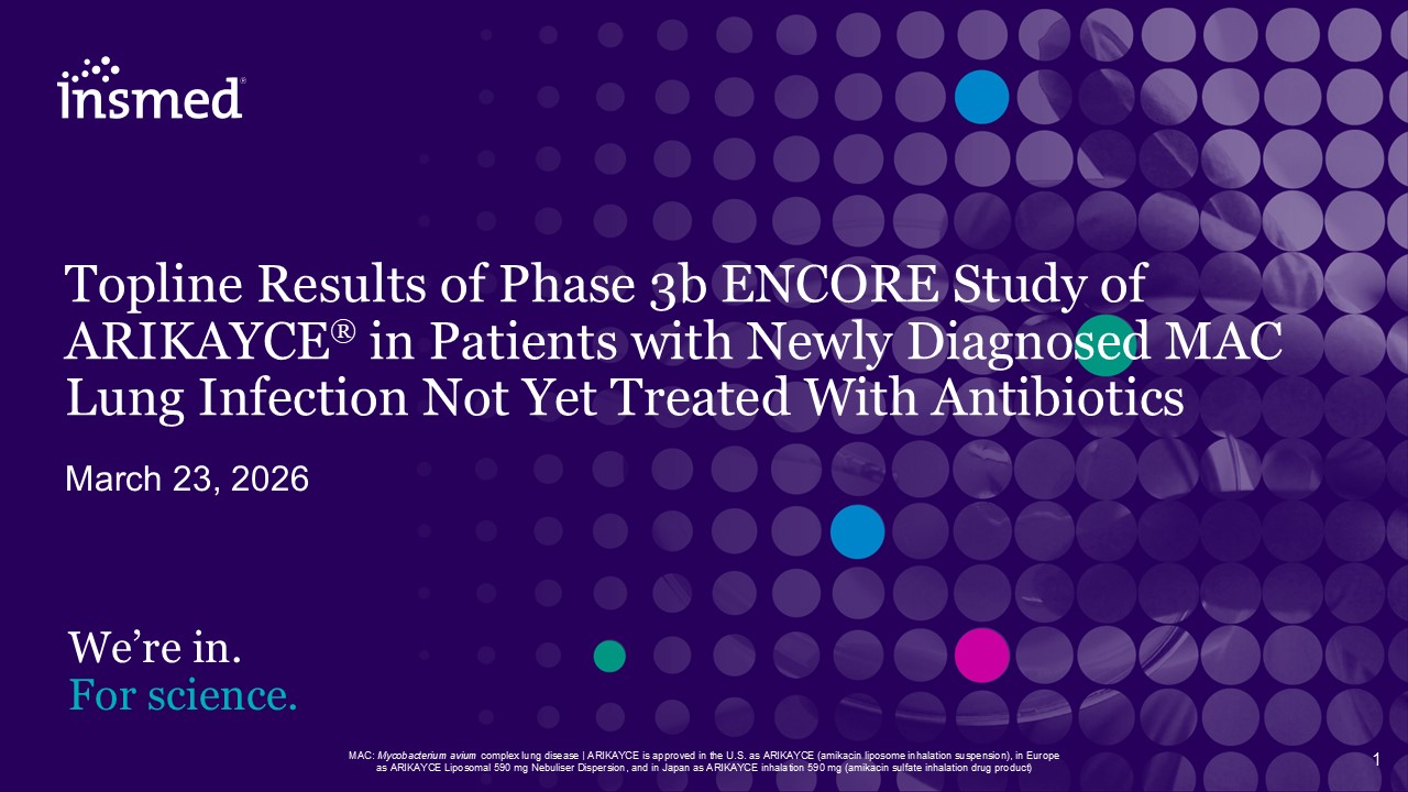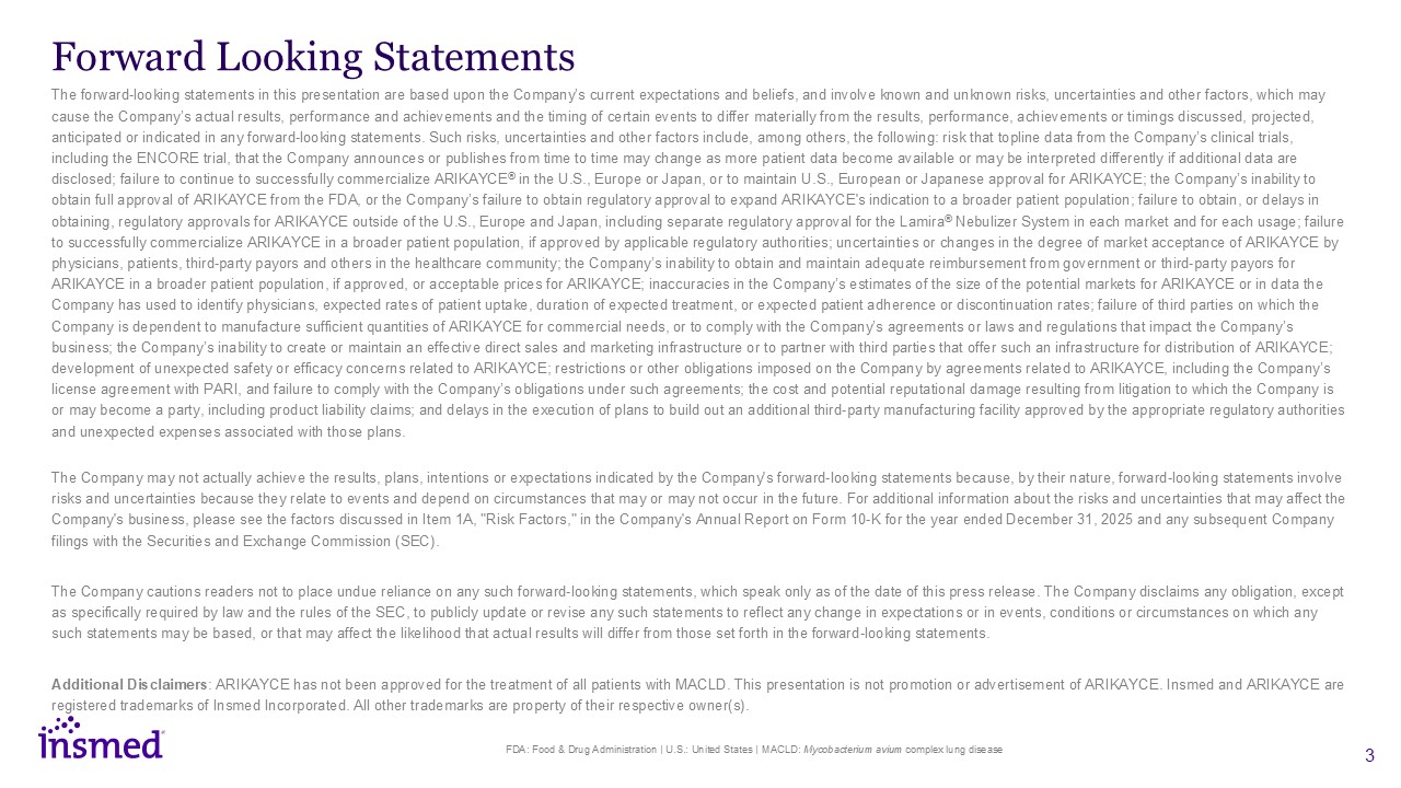 Forward Looking Statements  The forward-looking statements in this presentation are based upon the Company’s current expectations and beliefs, and involve known and unknown risks, uncertainties and other factors, which may cause the Company’s actual results, performance and achievements and the timing of certain events to differ materially from the results, performance, achievements or timings discussed, projected, anticipated or indicated in any forward-looking statements. Such risks, uncertainties and other factors include, among others, the following: risk that topline data from the Company’s clinical trials, including the ENCORE trial, that the Company announces or publishes from time to time may change as more patient data become available or may be interpreted differently if additional data are disclosed; failure to continue to successfully commercialize ARIKAYCE® in the U.S., Europe or Japan, or to maintain U.S., European or Japanese approval for ARIKAYCE; the Company’s inability to obtain full approval of ARIKAYCE from the FDA, or the Company’s failure to obtain regulatory approval to expand ARIKAYCE's indication to a broader patient population; failure to obtain, or delays in obtaining, regulatory approvals for ARIKAYCE outside of the U.S., Europe and Japan, including separate regulatory approval for the Lamira® Nebulizer System in each market and for each usage; failure to successfully commercialize ARIKAYCE in a broader patient population, if approved by applicable regulatory authorities; uncertainties or changes in the degree of market acceptance of ARIKAYCE by physicians, patients, third-party payors and others in the healthcare community; the Company’s inability to obtain and maintain adequate reimbursement from government or third-party payors for ARIKAYCE in a broader patient population, if approved, or acceptable prices for ARIKAYCE; inaccuracies in the Company’s estimates of the size of the potential markets for ARIKAYCE or in data the Company has used to identify physicians, expected rates of patient uptake, duration of expected treatment, or expected patient adherence or discontinuation rates; failure of third parties on which the Company is dependent to manufacture sufficient quantities of ARIKAYCE for commercial needs, or to comply with the Company’s agreements or laws and regulations that impact the Company’s business; the Company’s inability to create or maintain an effective direct sales and marketing infrastructure or to partner with third parties that offer such an infrastructure for distribution of ARIKAYCE; development of unexpected safety or efficacy concerns related to ARIKAYCE; restrictions or other obligations imposed on the Company by agreements related to ARIKAYCE, including the Company’s license agreement with PARI, and failure to comply with the Company’s obligations under such agreements; the cost and potential reputational damage resulting from litigation to which the Company is or may become a party, including product liability claims; and delays in the execution of plans to build out an additional third-party manufacturing facility approved by the appropriate regulatory authorities and unexpected expenses associated with those plans.  The Company may not actually achieve the results, plans, intentions or expectations indicated by the Company's forward-looking statements because, by their nature, forward-looking statements involve risks and uncertainties because they relate to events and depend on circumstances that may or may not occur in the future. For additional information about the risks and uncertainties that may affect the Company's business, please see the factors discussed in Item 1A, "Risk Factors," in the Company's Annual Report on Form 10-K for the year ended December 31, 2025 and any subsequent Company filings with the Securities and Exchange Commission (SEC).     The Company cautions readers not to place undue reliance on any such forward-looking statements, which speak only as of the date of this press release. The Company disclaims any obligation, except as specifically required by law and the rules of the SEC, to publicly update or revise any such statements to reflect any change in expectations or in events, conditions or circumstances on which any such statements may be based, or that may affect the likelihood that actual results will differ from those set forth in the forward-looking statements.  Additional Disclaimers: ARIKAYCE has not been approved for the treatment of all patients with MACLD. This presentation is not promotion or advertisement of ARIKAYCE. Insmed and ARIKAYCE are registered trademarks of Insmed Incorporated. All other trademarks are property of their respective owner(s).   FDA: Food & Drug Administration | U.S.: United States | MACLD: Mycobacterium avium complex lung disease