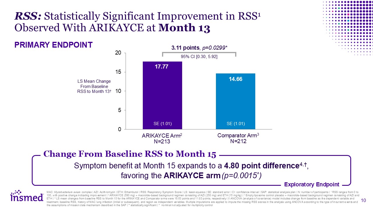 MAC: Mycobacterium avium complex | AZI: Azithromycin | ETH: Ethambutol | RSS: Respiratory Symptom Score | LS: least-squares | SE: standard error | CI: confidence interval | SAP: statistical analysis plan | N: number of participants | 1 RSS ranges from 0 to 100, with positive change indicating improvement | 2 ARIKAYCE (590 mg) + macrolide-based background regimen consisting of AZI (250 mg) and ETH (15 mg/kg) | 3 Empty liposome control placebo + macrolide-based background regimen consisting of AZI and ETH | 4 LS mean changes from baseline RSS to Month 15 for the ARIKAYCE and Comparator arms were 16.63 points and 11.83 points, respectively | † ANCOVA (analysis of covariance) model includes change from baseline as the dependent variable and treatment, baseline RSS, history of MAC lung infection (initial or subsequent), and region as independent variables. Multiple imputations are applied to impute the missing RSS scores in the analysis using ANCOVA according to the type of incurrent events and the assumptions of mission data mechanism described in the SAP | * statistically significant | ^ nominal not adjusted for multiplicity control  Symptom benefit at Month 15 expands to a 4.80 point difference4,†, favoring the ARIKAYCE arm (p=0.0015^)  Exploratory Endpoint  RSS: Statistically Significant Improvement in RSS1 Observed With ARIKAYCE at Month 13  PRIMARY ENDPOINT  LS Mean Change From Baseline   RSS to Month 13†  ARIKAYCE Arm2  N=213  Comparator Arm3  N=212  3.11 points, p=0.0299*  95% CI [0.30, 5.92]  SE (1.01)  SE (1.01)  Change From Baseline RSS to Month 15