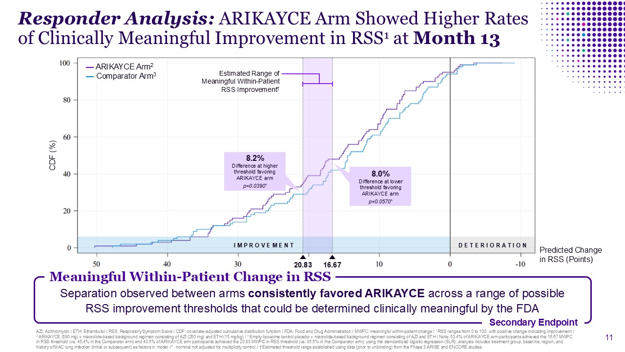 Responder Analysis: ARIKAYCE Arm Showed Higher Rates of Clinically Meaningful Improvement in RSS1 at Month 13   Meaningful Within-Patient Change in RSS  Secondary Endpoint  Separation observed between arms consistently favored ARIKAYCE across a range of possible   RSS improvement thresholds that could be determined clinically meaningful by the FDA  CDF (%)  16.67  — ARIKAYCE Arm2  — Comparator Arm3  8.0%  Difference at lower threshold favoring ARIKAYCE arm  p=0.0570^  8.2%  Difference at higher threshold favoring ARIKAYCE arm  p=0.0390^   Predicted Change in RSS (Points)  I M P R O V E M E N T  D E T E R I O R A T I O N  Estimated Range of Meaningful Within-Patient RSS Improvement†  20.83  AZI: Azithromycin | ETH: Ethambutol | RSS: Respiratory Symptom Score | CDF: covariate-adjusted cumulative distribution function | FDA: Food and Drug Administration | MWPC: meaningful within-patient change | 1 RSS ranges from 0 to 100, with positive change indicating improvement | 2 ARIKAYCE (590 mg) + macrolide-based background regimen consisting of AZI (250 mg) and ETH (15 mg/kg) | 3 Empty liposome control placebo + macrolide-based background regimen consisting of AZI and ETH | Note: 53.4% of ARIKAYCE arm participants achieved the 16.67 MWPC in RSS threshold (vs. 45.4% in the Comparator arm) and 43.5% of ARIKAYCE arm participants achieved the 20.83 MWPC in RSS threshold (vs. 35.5% in the Comparator arm); using the standardized logistic regression (SLR); analysis includes treatment group, baseline, region, and history of MAC lung infection (initial or subsequent) as factors in model | ^ nominal not adjusted for multiplicity control | † Estimated threshold range established using data (prior to unblinding) from the Phase 3 ARISE and ENCORE studies