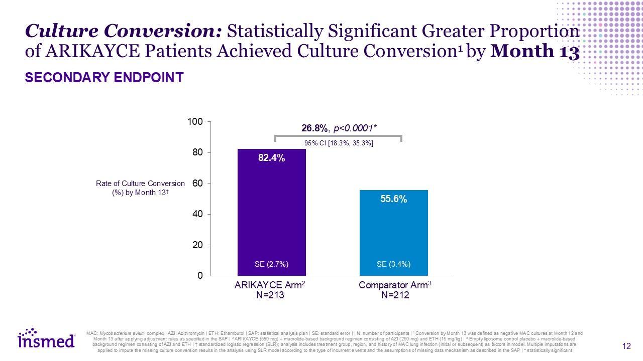 MAC: Mycobacterium avium complex | AZI: Azithromycin | ETH: Ethambutol | SAP: statistical analysis plan | SE: standard error | | N: number of participants | 1 Conversion by Month 13 was defined as negative MAC cultures at Month 12 and Month 13 after applying adjustment rules as specified in the SAP | 2 ARIKAYCE (590 mg) + macrolide-based background regimen consisting of AZI (250 mg) and ETH (15 mg/kg) | 3 Empty liposome control placebo + macrolide-based background regimen consisting of AZI and ETH | † standardized logistic regression (SLR); analysis includes treatment group, region, and history of MAC lung infection (initial or subsequent) as factors in model. Multiple imputations are applied to impute the missing culture conversion results in the analysis using SLR model according to the type of incurrent events and the assumptions of missing data mechanism as described in the SAP | * statistically significant  26.8%, p<0.0001*  95% CI [18.3%, 35.3%]  Rate of Culture Conversion (%) by Month 13†  ARIKAYCE Arm2  N=213  Comparator Arm3  N=212  Culture Conversion: Statistically Significant Greater Proportion of ARIKAYCE Patients Achieved Culture Conversion1 by Month 13  SECONDARY ENDPOINT  SE (2.7%)  SE (3.4%)