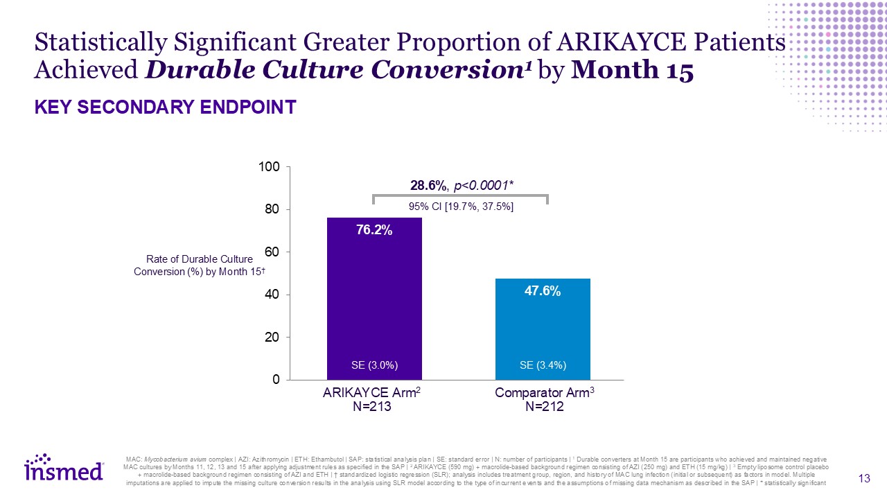 MAC: Mycobacterium avium complex | AZI: Azithromycin | ETH: Ethambutol | SAP: statistical analysis plan | SE: standard error | N: number of participants | 1 Durable converters at Month 15 are participants who achieved and maintained negative MAC cultures by Months 11, 12, 13 and 15 after applying adjustment rules as specified in the SAP | 2 ARIKAYCE (590 mg) + macrolide-based background regimen consisting of AZI (250 mg) and ETH (15 mg/kg) | 3 Empty liposome control placebo + macrolide-based background regimen consisting of AZI and ETH | † standardized logistic regression (SLR); analysis includes treatment group, region, and history of MAC lung infection (initial or subsequent) as factors in model. Multiple imputations are applied to impute the missing culture conversion results in the analysis using SLR model according to the type of incurrent events and the assumptions of missing data mechanism as described in the SAP | * statistically significant  28.6%, p<0.0001*  95% CI [19.7%, 37.5%]  Rate of Durable Culture Conversion (%) by Month 15†  ARIKAYCE Arm2  N=213  Comparator Arm3  N=212  Statistically Significant Greater Proportion of ARIKAYCE Patients Achieved Durable Culture Conversion1 by Month 15  KEY SECONDARY ENDPOINT  SE (3.0%)  SE (3.4%)