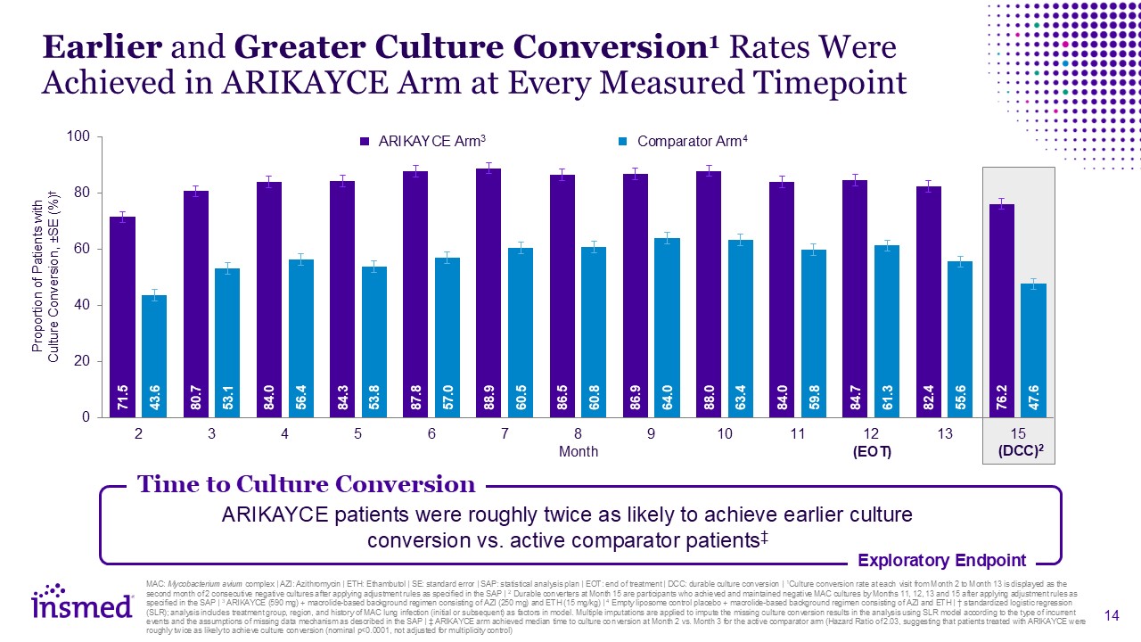 Earlier and Greater Culture Conversion1 Rates Were Achieved in ARIKAYCE Arm at Every Measured Timepoint  Proportion of Patients with Culture Conversion, ±SE (%)†  Month  ARIKAYCE Arm3  Comparator Arm4  MAC: Mycobacterium avium complex | AZI: Azithromycin | ETH: Ethambutol | SE: standard error | SAP: statistical analysis plan | EOT: end of treatment | DCC: durable culture conversion | 1Culture conversion rate at each visit from Month 2 to Month 13 is displayed as the second month of 2 consecutive negative cultures after applying adjustment rules as specified in the SAP | 2 Durable converters at Month 15 are participants who achieved and maintained negative MAC cultures by Months 11, 12, 13 and 15 after applying adjustment rules as specified in the SAP | 3 ARIKAYCE (590 mg) + macrolide-based background regimen consisting of AZI (250 mg) and ETH (15 mg/kg) | 4 Empty liposome control placebo + macrolide-based background regimen consisting of AZI and ETH | † standardized logistic regression (SLR); analysis includes treatment group, region, and history of MAC lung infection (initial or subsequent) as factors in model. Multiple imputations are applied to impute the missing culture conversion results in the analysis using SLR model according to the type of incurrent events and the assumptions of missing data mechanism as described in the SAP | ‡ ARIKAYCE arm achieved median time to culture conversion at Month 2 vs. Month 3 for the active comparator arm (Hazard Ratio of 2.03, suggesting that patients treated with ARIKAYCE were roughly twice as likely to achieve culture conversion (nominal p<0.0001, not adjusted for multiplicity control)  Time to Culture Conversion  Exploratory Endpoint  ARIKAYCE patients were roughly twice as likely to achieve earlier culture conversion vs. active comparator patients‡  (EOT)  (DCC)2