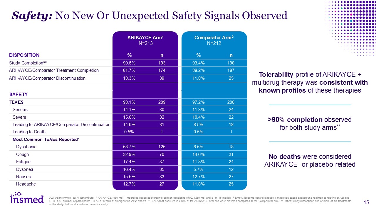 Safety: No New Or Unexpected Safety Signals Observed   ​ARIKAYCE Arm1  N=213  Comparator Arm2  N=212  DISPOSITION  %  n  %  n  Study Completion**  90.6%  193  93.4%  198  ARIKAYCE/Comparator Treatment Completion  81.7%  174  88.2%  187  ARIKAYCE/Comparator Discontinuation  18.3%  39  11.8%  25  SAFETY  TEAES  98.1%  209  97.2%  206   Serious  14.1%  30  11.3%  24   Severe  15.0%  32  10.4%  22   Leading to ARIKAYCE/Comparator Discontinuation  14.6%  31  8.5%  18   Leading to Death  0.5%  1  0.5%  1  Most Common TEAEs Reported*   Dysphonia  58.7%  125  8.5%  18   Cough  32.9%  70  14.6%  31   Fatigue  17.4%  37  11.3%  24   Dyspnea  16.4%  35  5.7%  12   Nausea  15.5%  33  12.7%  27   Headache  12.7%  27  11.8%  25  AZI: Azithromycin | ETH: Ethambutol | 1 ARIKAYCE (590 mg) + macrolide-based background regimen consisting of AZI (250 mg) and ETH (15 mg/kg) | 2 Empty liposome control placebo + macrolide-based background regimen consisting of AZI and ETH | n/N: number of participants | TEAEs: treatment-emergent adverse effects | * TEAEs that occurred in ≥10% of the ARIKAYCE arm and were elevated compared to the Comparator arm | ** Patients may discontinue one or more of the treatments in the study, but not discontinue the entire study  Tolerability profile of ARIKAYCE + multidrug therapy was consistent with known profiles of these therapies  >90% completion observed for both study arms**   No deaths were considered ARIKAYCE- or placebo-related