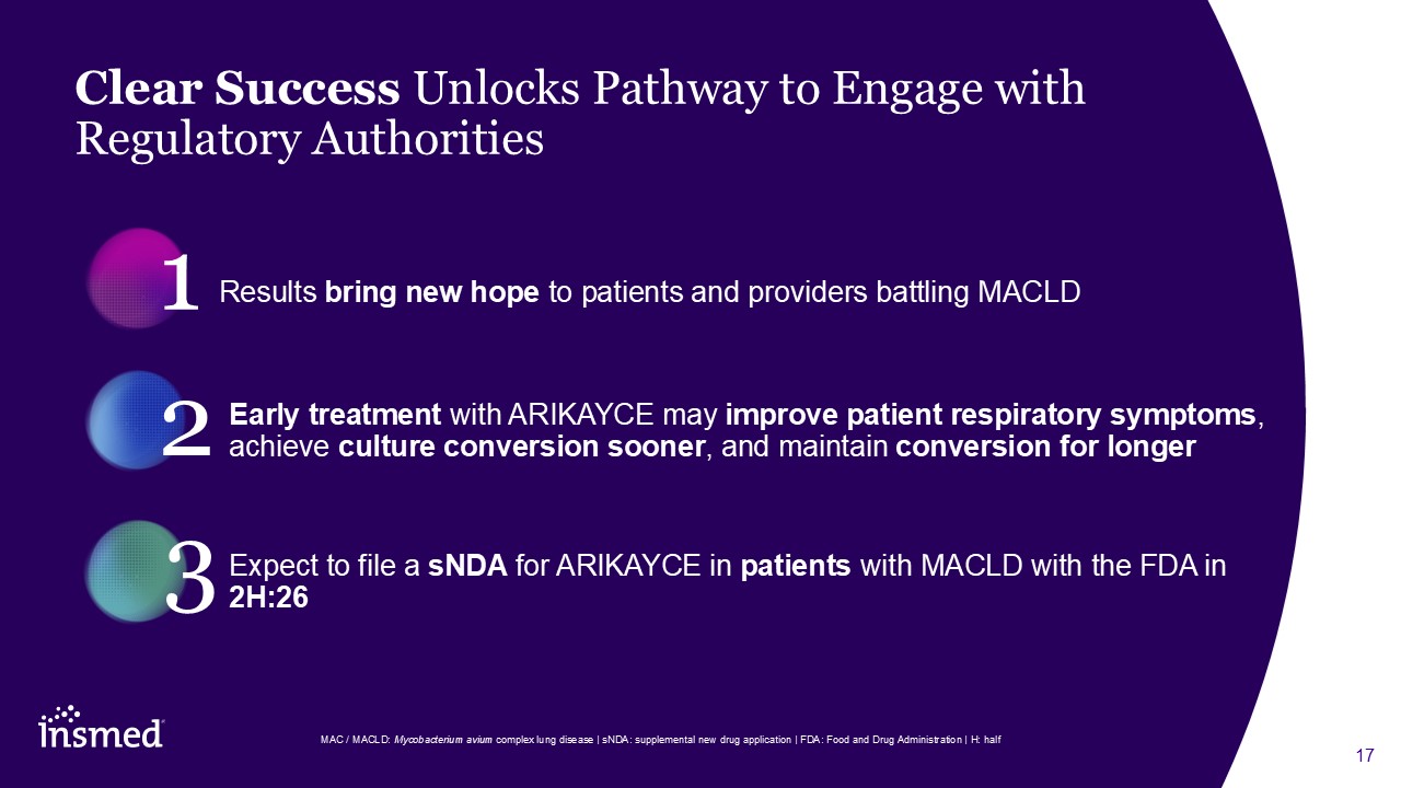 Results bring new hope to patients and providers battling MACLD  Early treatment with ARIKAYCE may improve patient respiratory symptoms, achieve culture conversion sooner, and maintain conversion for longer  Expect to file a sNDA for ARIKAYCE in patients with MACLD with the FDA in 2H:26  MAC / MACLD: Mycobacterium avium complex lung disease | sNDA: supplemental new drug application | FDA: Food and Drug Administration | H: half  Clear Success Unlocks Pathway to Engage with Regulatory Authorities